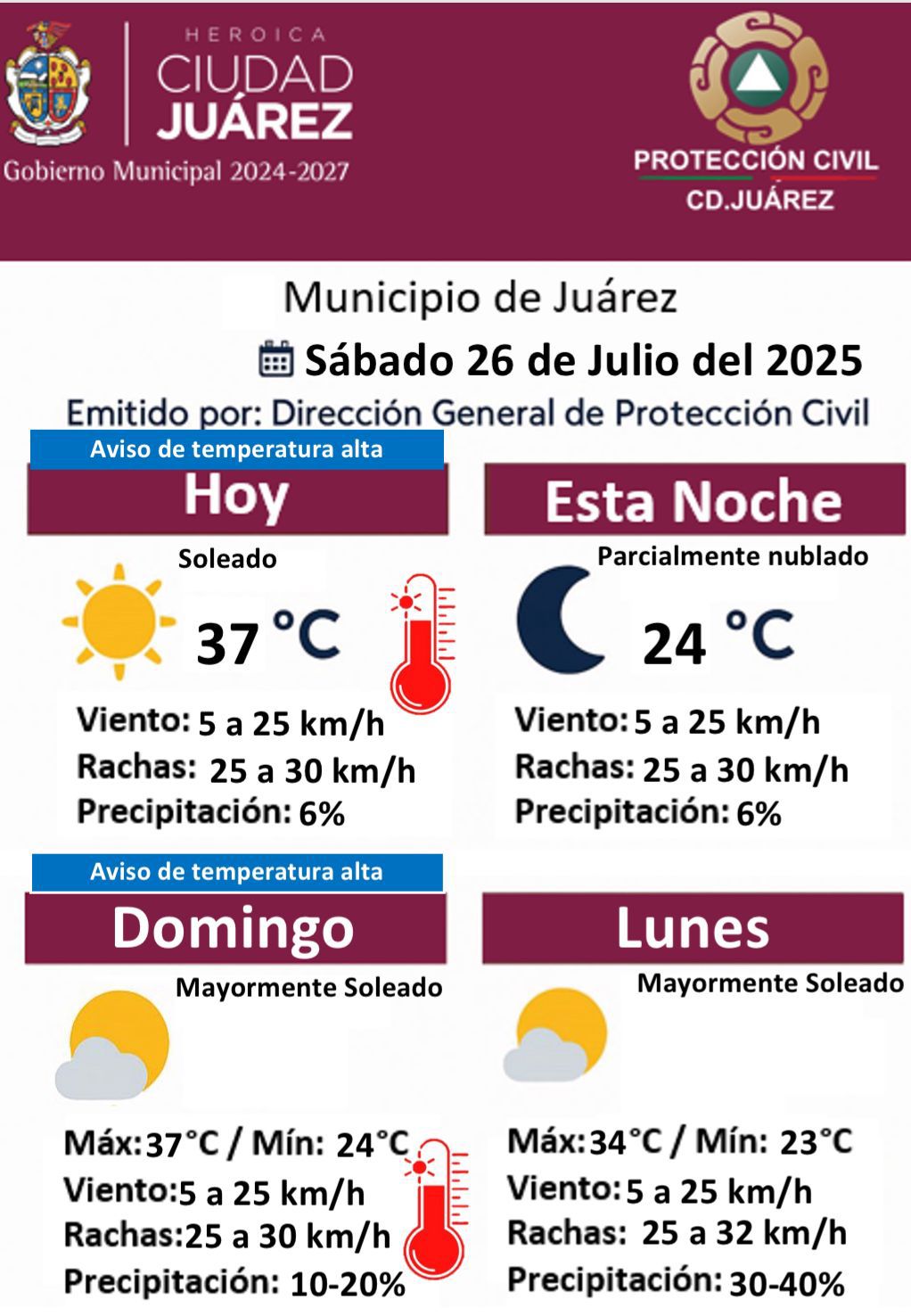 Sábado 26 de Julio del 2025.- La Dirección General de Protección Civil del Municipio de Juárez emitió un aviso de temperatura alta para este sábado 26 de julio de 2025, debido a las condiciones climáticas extremas que se presentan en la región.