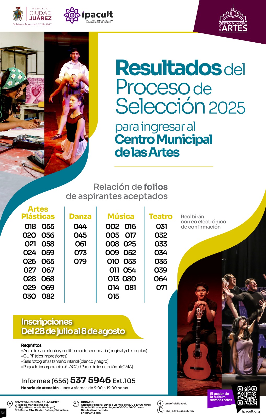 Lunes 28 de Julio del 2025.- El Instituto para la Cultura del Municipio de Juárez (IPACULT) informa a la comunidad los resultados del proceso de selección para ingresar a las carreras técnico-profesionales de artes plásticas, danza, música y teatro que se imparten en el Centro Municipal de las Artes (CMA).