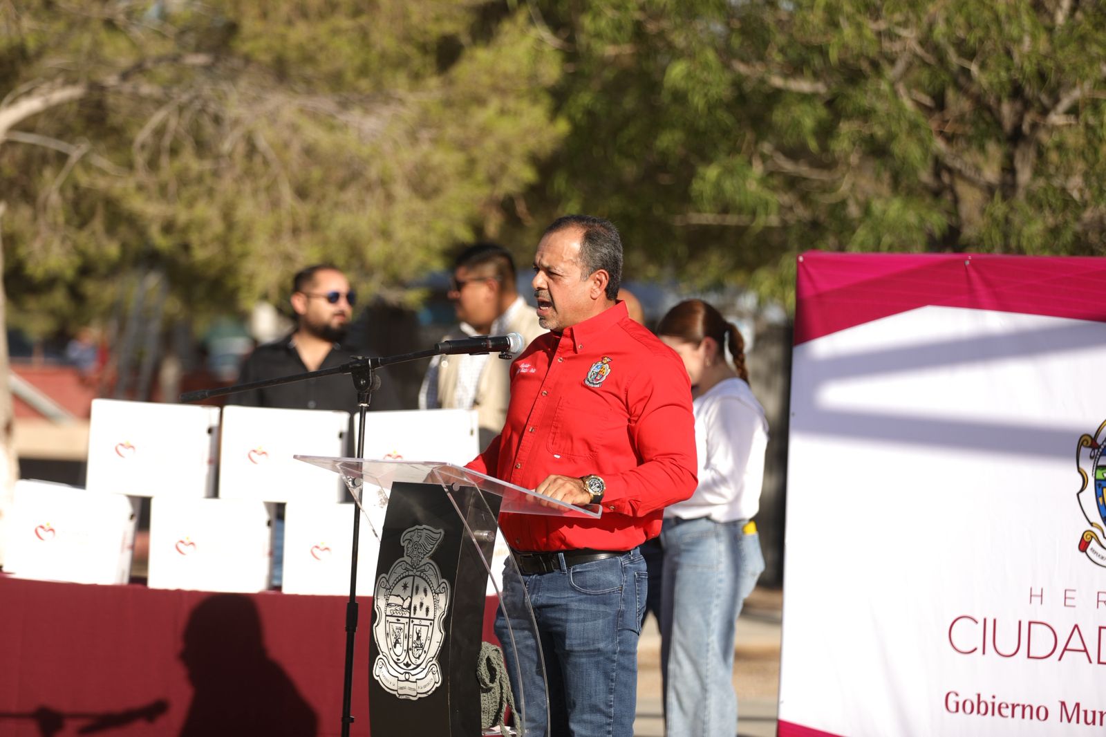 “Aquí vamos a seguir atentos como lo hacemos todos los días, trabajando por y para Juárez”, agregó el edil, para luego hacer la primera entrega simbólica a una de las representantes de comité vecinal.