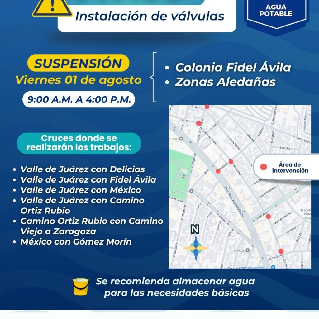 Como parte del proyecto de sectorización del distrito de operación número 5, la Junta de Agua y Saneamiento de Juárez instalará mañana viernes, 1 de agosto, seis válvulas de seccionamiento en la colonia Fidel Ávila. Estas labores, que estarán a cargo de un contratista externo bajo la supervisión del Departamento de Eficiencia Física de la J+, se realizarán en un…