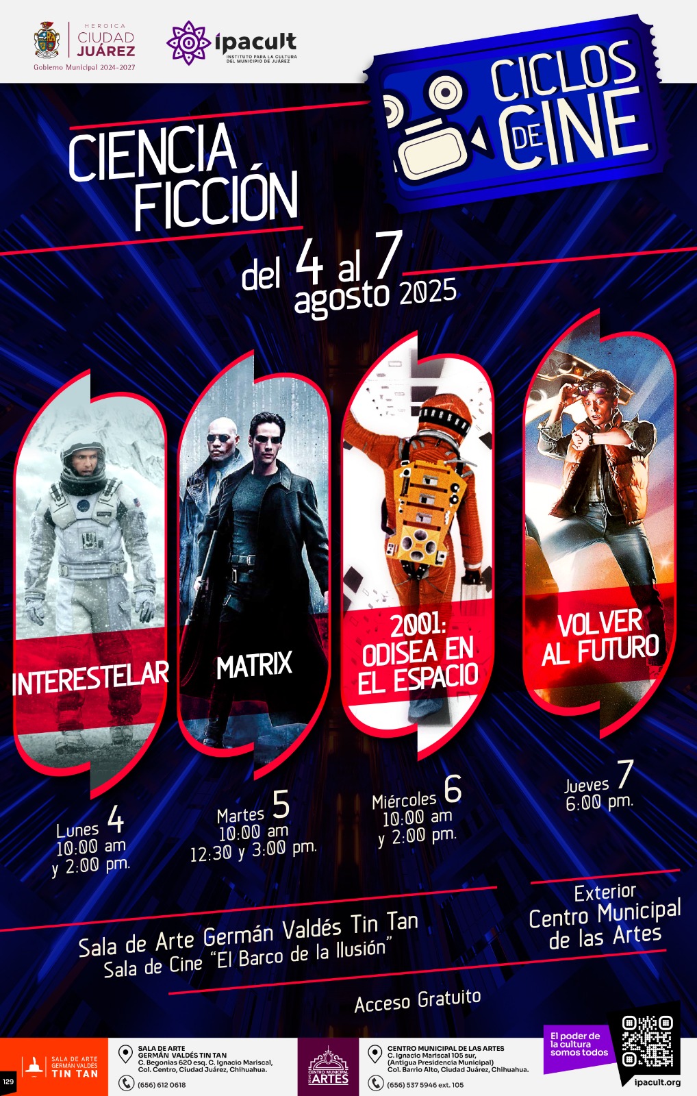 Viernes 1 de Agosto del 2025.- El Instituto para la Cultura del Municipio de Juárez (IPACULT), a través de su programa “Ciclos de Cine”, invita a la ciudadanía a vivir una experiencia cinematográfica fuera de este mundo, con la proyección de películas de ciencia ficción del 4 al 7 de agosto, en la sala del Barco de la Ilusión, ubicada dentro de la Sala de Arte Germán Valdés “Tin Tan” y en la explanada del Centro Municipal de las Artes (CMA).