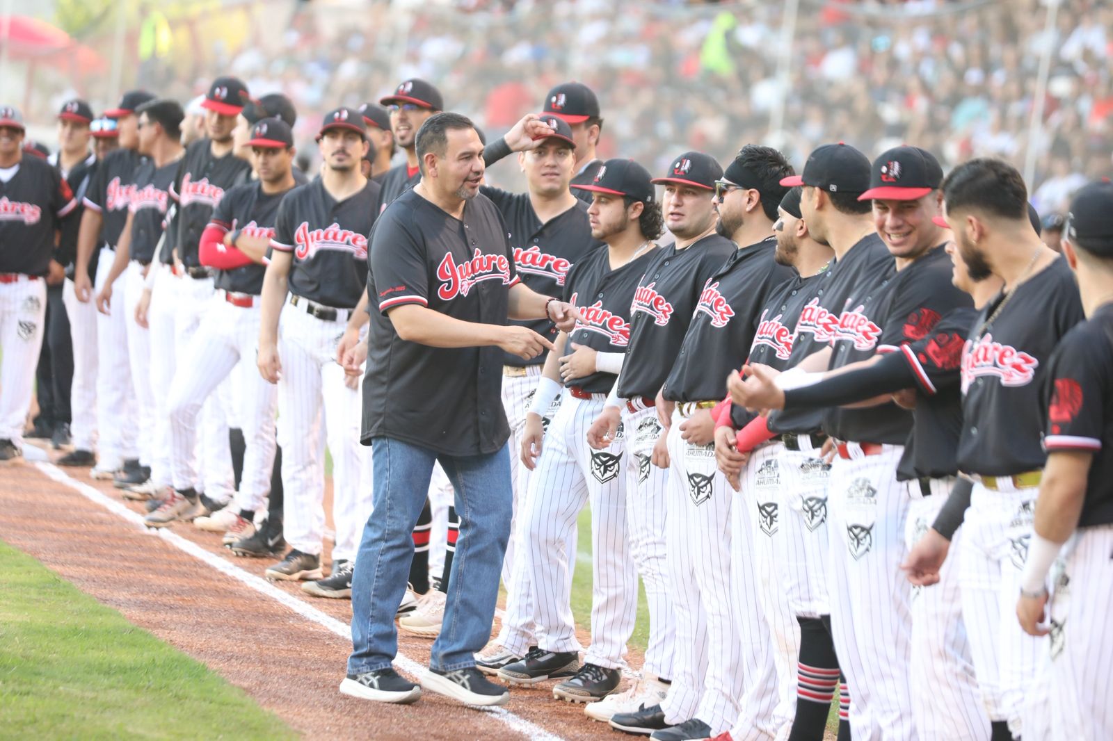 Sábado 2 de Agosto del 2025.- El Presidente Municipal, Cruz Pérez Cuéllar, fue encargado de lanzar la primera bola en el encuentro de semifinales de los Indios de Ciudad Juárez contra los Algodoneros de Delicias.