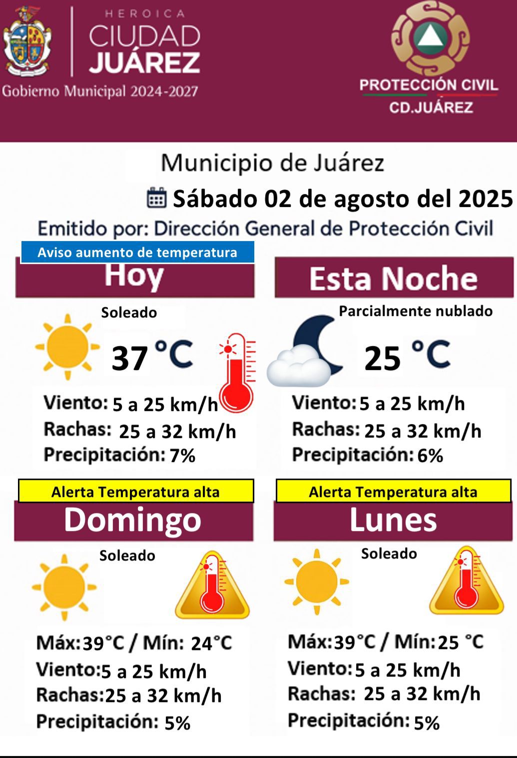 Sábado 2 de Agosto del 2025.- La Dirección General de Protección Civil del Municipio de Juárez emitió un aviso por aumento de temperatura para este sábado 2 de agosto de 2025. Se pronostica un día soleado con una temperatura máxima de 37 grados Celsius. El viento oscilará entre los 5 y 25 km/h, con rachas de hasta 32 km/h y una probabilidad de precipitación del 7%.