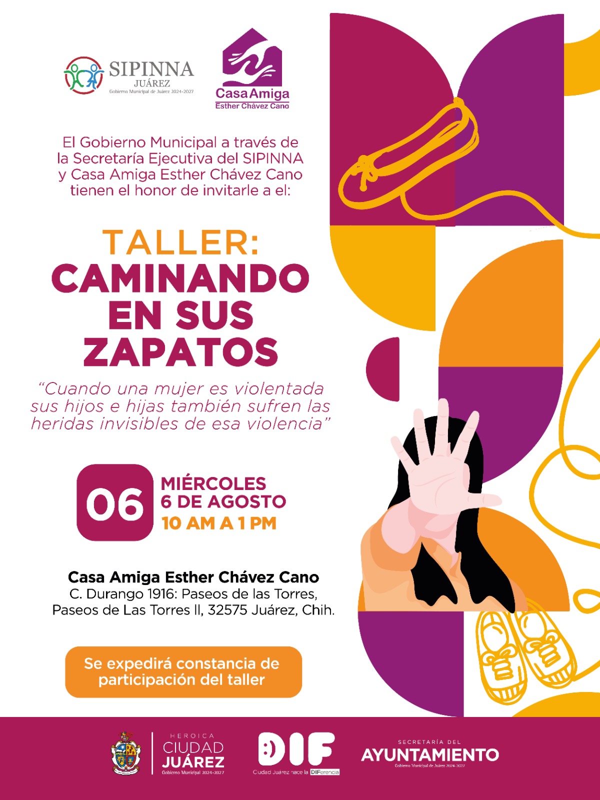 Martes 5 de Agosto del 2025.- El Gobierno Municipal de Juárez, a través de la Secretaría Ejecutiva del SIPINNA y en colaboración con Casa Amiga Esther Chávez Cano, llevará a cabo el taller “Caminando en sus Zapatos”, mañana miércoles 6 de agosto de 10:00 de la mañana a la 1:00 de la tarde en las instalaciones de Casa Amiga, ubicadas en C. Durango 1916, fraccionamiento Paseos de las Torres II.