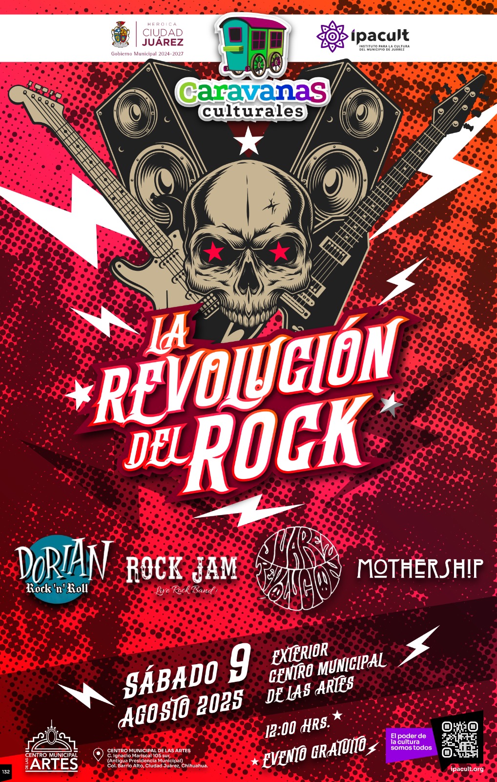 Jueves 7 de Agosto del 2025.- El Instituto para la Cultura del Municipio de Juárez (IPACULT) invita a la ciudadanía a disfrutar de la Caravana Cultural “La Revolución del Rock”, que se llevará a cabo este sábado 09 de agosto a partir de las 12:00 del mediodía al exterior del Centro Municipal de las Artes (CMA), en la Zona Centro.