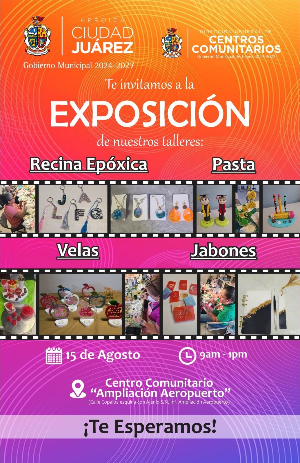 Miércoles 13 de Agosto del 2025.- El próximo viernes 15, de 9:00 de la mañana a 1:00 de la tarde, en el Centro Comunitario Ampliación Aeropuerto se llevará a cabo una exposición de los trabajos elaborados por las personas que acuden a los talleres que se ofrecen en estos espacios.
