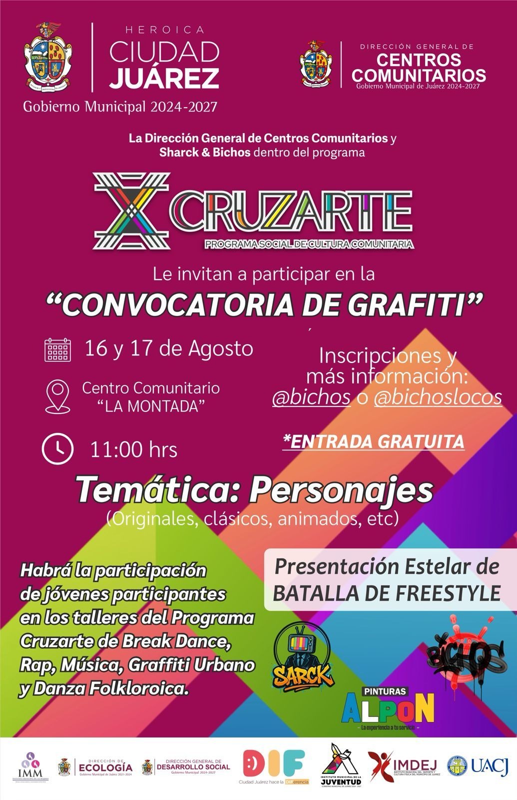 Jueves 14 de Agosto del 2025.- La Dirección de Centros Comunitarios, en coordinación con Bichos Colectivo y como parte del programa Cruzarte, invitan a la ciudadanía a participar en el concurso de grafiti.
