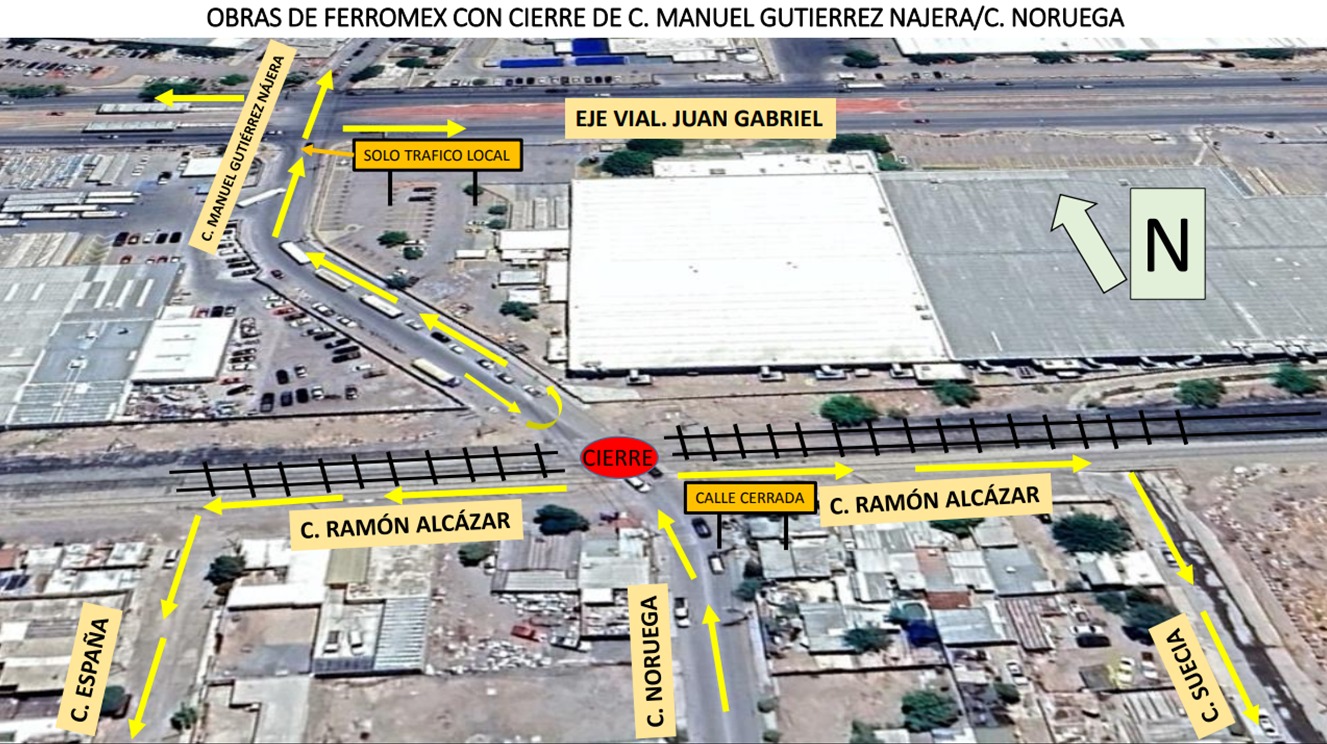 Lunes 18 de Agosto del 2025.- La Coordinación General de Seguridad Vial informa a la ciudadanía que, a partir del próximo jueves 21 de agosto, la calle Noruega permanecerá cerrada en ambos sentidos, de sur a norte y de norte a sur, en su cruce con las vías del tren.