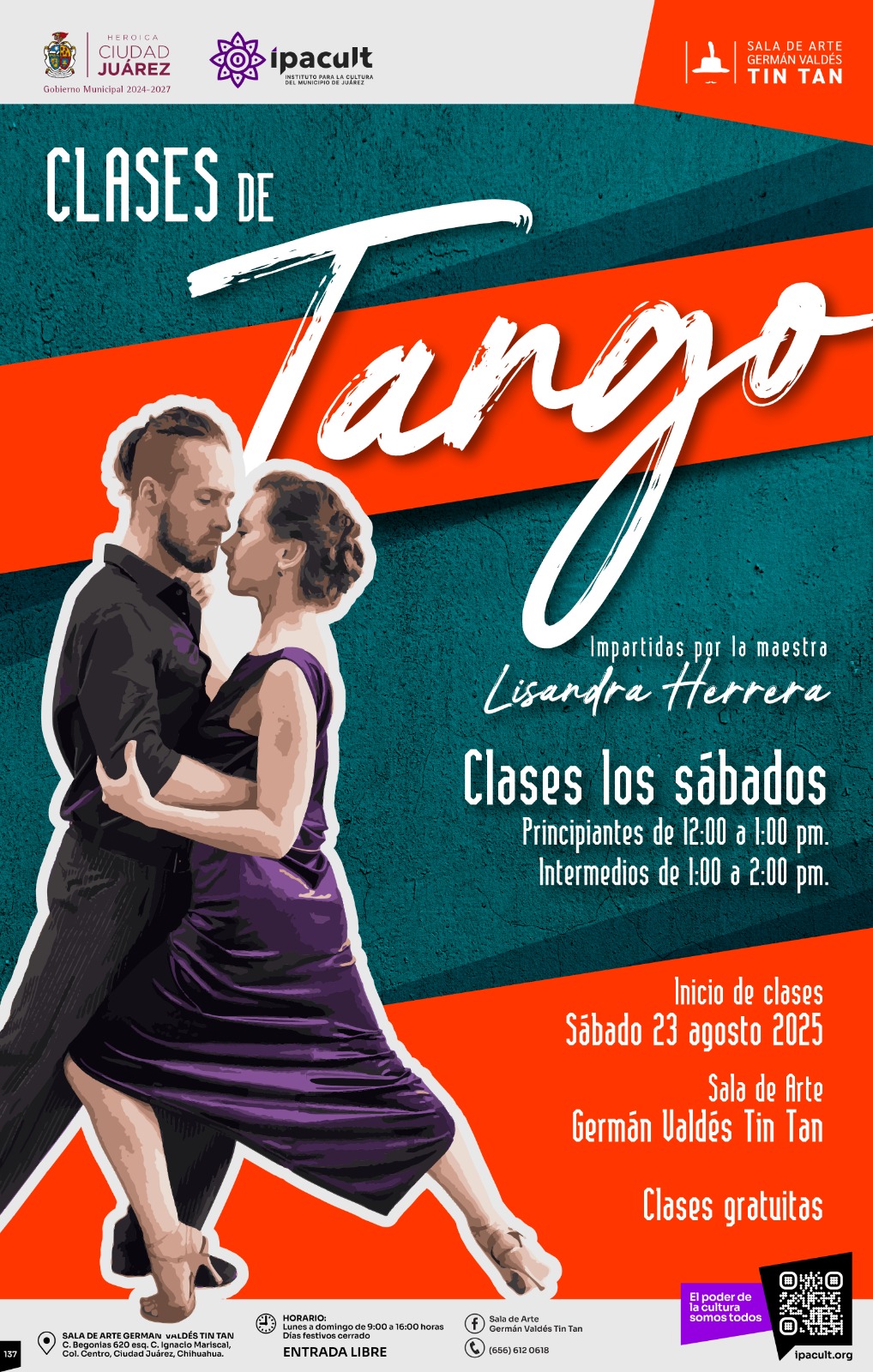 Miércoles 20 de Agosto del 2025.- El emblemático ritmo del Río de la Plata volverá a sentirse en Ciudad Juárez con el reinicio de las clases de tango en la Sala de Arte Germán Valdés “Tin Tan”, una propuesta del Instituto para la Cultura del Municipio de Juárez (IPACULT) que comenzará este sábado 23 de agosto al mediodía.