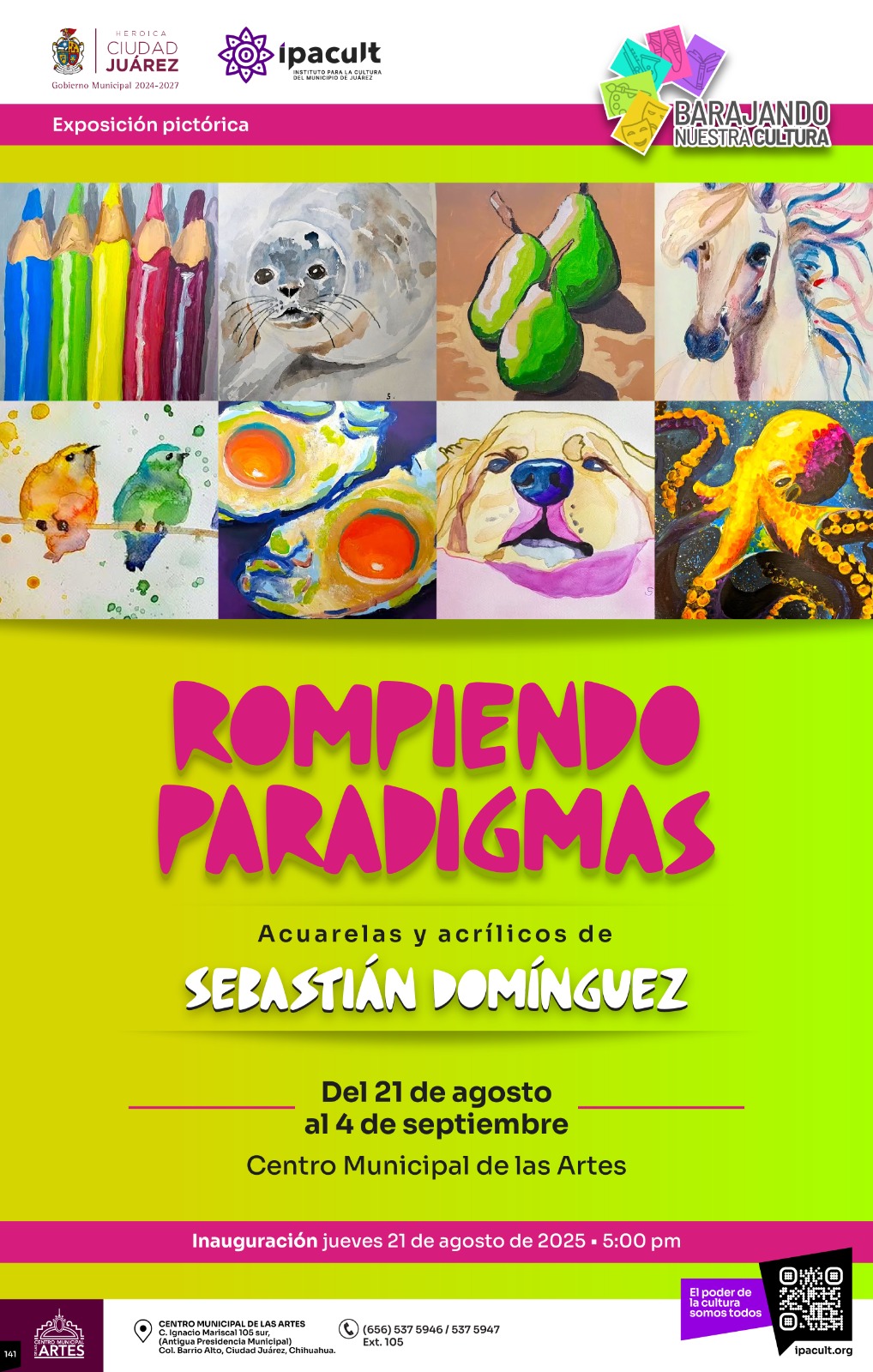 Miércoles 20 de Agosto del 2025.- El Instituto para la Cultura del Municipio de Juárez (IPACULT) invita a la ciudadanía a la inauguración de la exposición pictórica “Rompiendo paradigmas”, del joven artista infantil Sebastián Domínguez, que tendrá lugar el próximo jueves 21 de agosto a las 5:00 de la tarde en el Centro Municipal de las Artes (CMA).