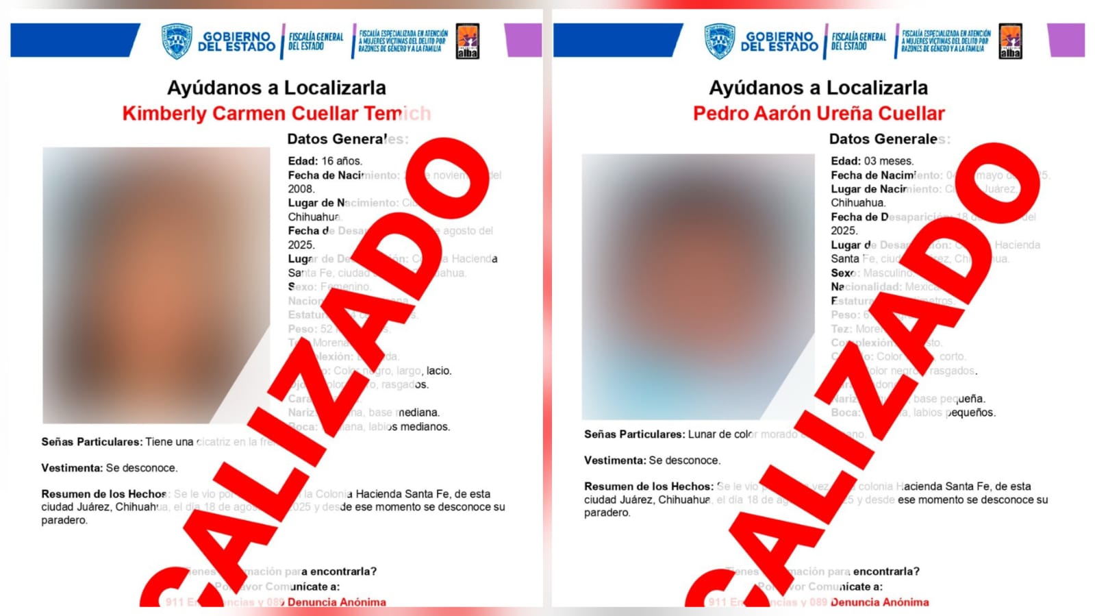 Ciudad Juárez, Chih., a 21 agosto de 2025.- Elementos de la Agencia Estatal de Investigación, adscritos a la Fiscalía Especializada en Atención a Mujeres Víctimas del Delito por Razones de Género y a la Familia en la Zona Norte, localizaron sanos y salvos a la adolescente identificadas con las iniciales K. C. C. T., de 16 años de edad, así como a su hijo de iniciales P. A. U. C., de tres meses de nacido.