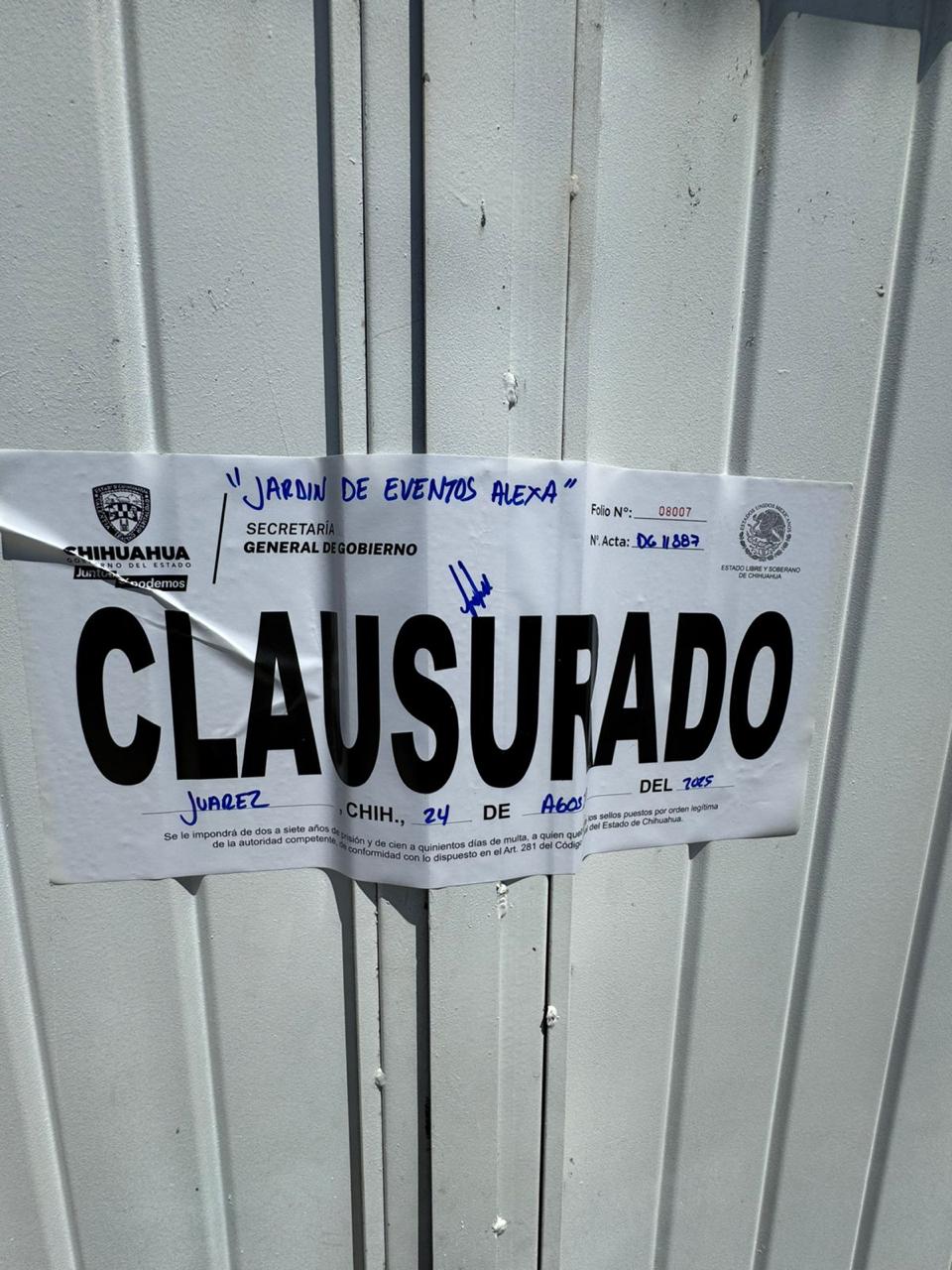 • Salón de eventos “Jardín las Chatas” por operar sin permiso