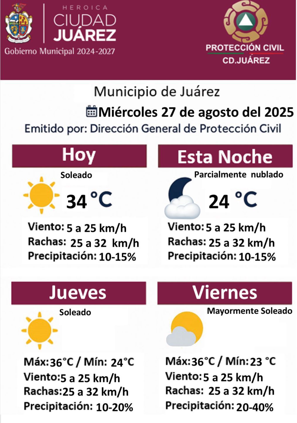 Miércoles 27 de Agosto del 2025.- La Dirección General de Protección Civil del Municipio dio a conocer el pronóstico del clima para los próximos días.