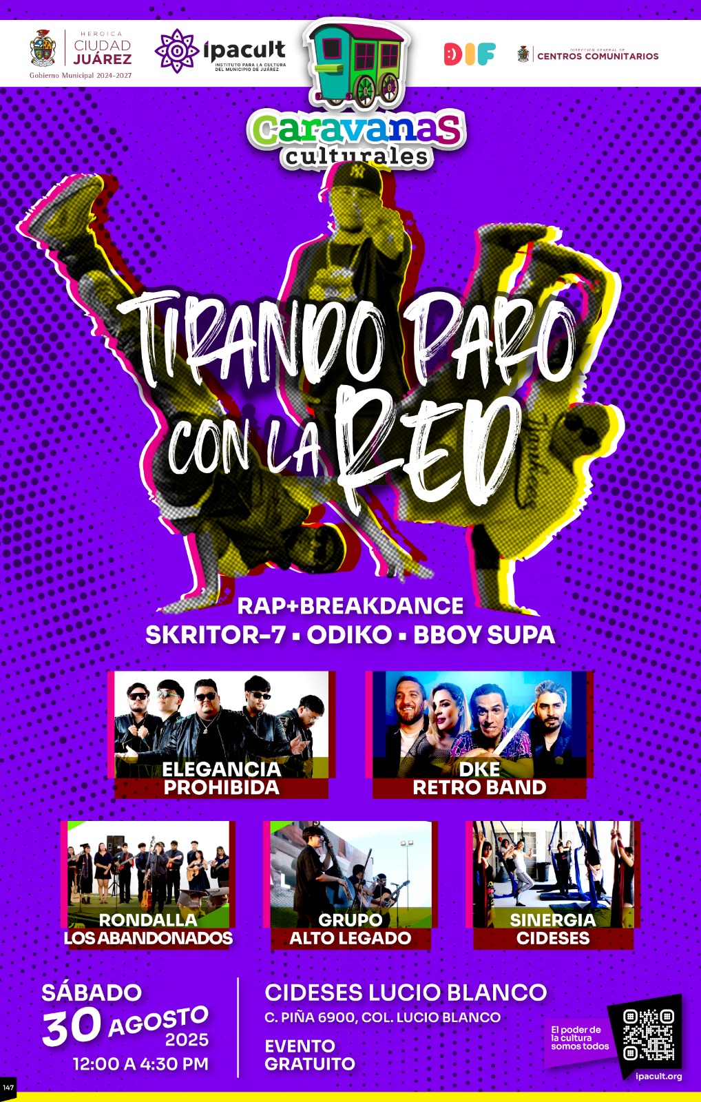 Viernes 29 de Agosto del 2025.- El arte y la música llegarán este sábado a la juventud con la Caravana Cultural “Tirando Paro con la Red”, organizada por el Instituto para la Cultura del Municipio de Juárez (IPACULT), que tendrá como sede el Centro de Investigaciones Desarrollo de Proyectos Sociales, Educativos y de Salud A.C. (CIDESES) Lucio Blanco, a partir de las 12:00 del mediodía.