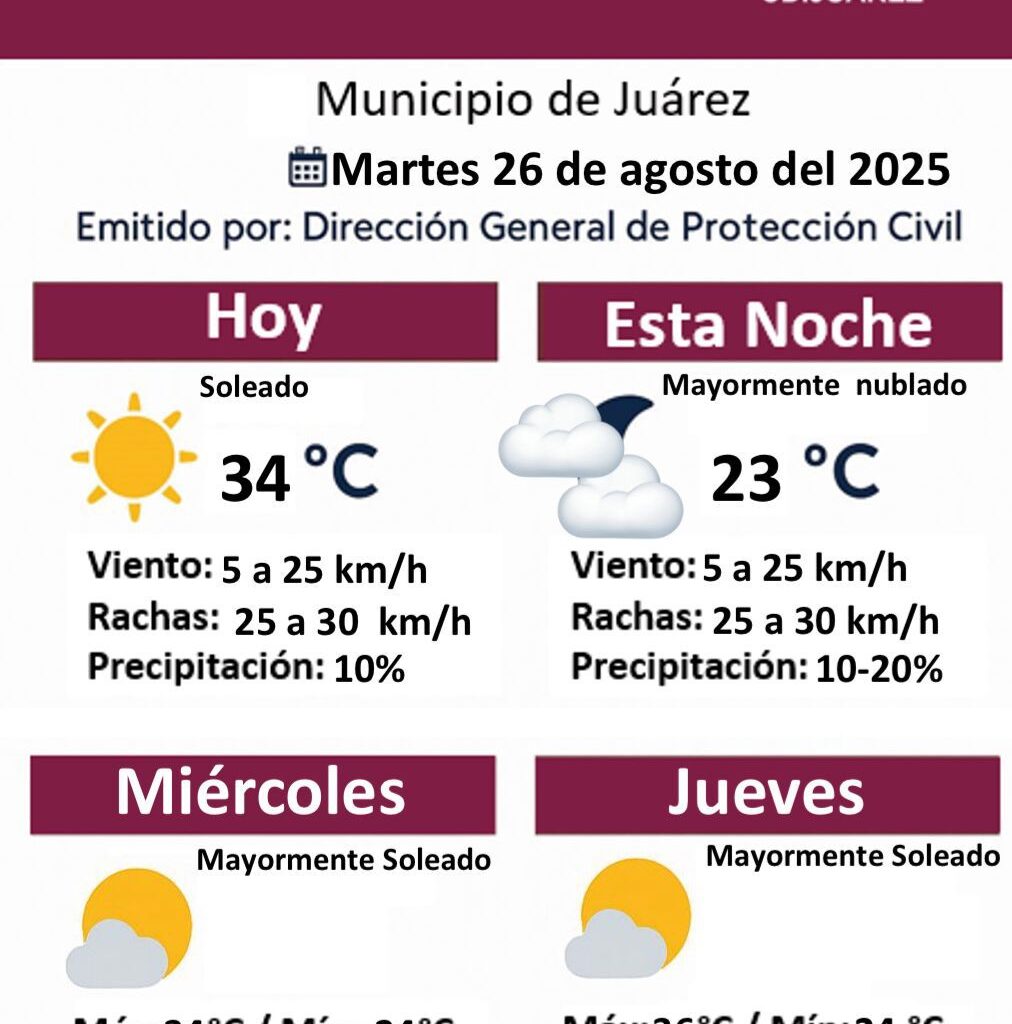 Martes 26 de Agosto del 2025.- La Dirección General de Protección Civil informó que este martes 26 de agosto el clima en Ciudad Juárez se mantendrá soleado, con una temperatura máxima de 34 grados centígrados. El viento alcanzará velocidades de 5 a 25 kilómetros por hora con rachas de hasta 30 km/h, mientras que la probabilidad de precipitación será del…