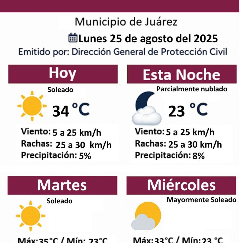 Lunes 25 de Agosto del 2025.- La Dirección General de Protección Civil del Municipio de Juárez dio a conocer el pronóstico del clima para este lunes 25 de agosto de 2025 y los próximos días. Para hoy se espera un día soleado con temperatura máxima de 34 grados centígrados, acompañado de vientos de 5 a 25 kilómetros por hora y…