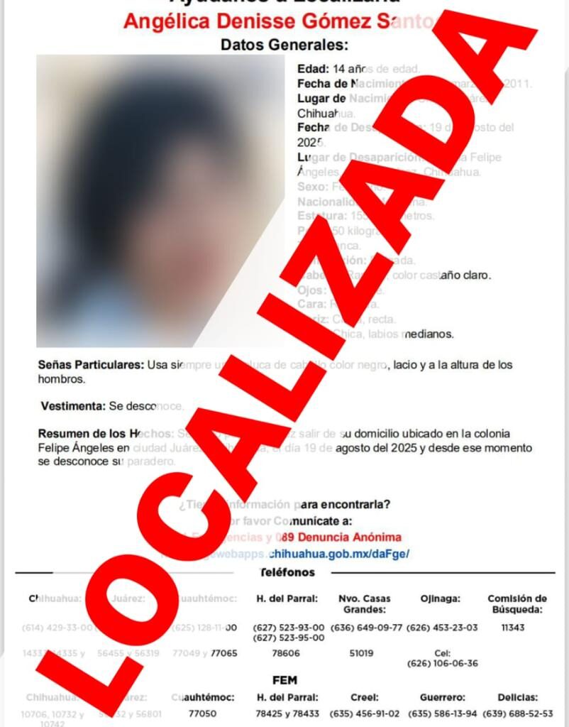 Ciudad Juárez, Chih., a 22 de agosto de 2025.- En seguimiento a las acciones inmediatas de búsqueda y localización de personas con reporte de ausencia y/o extravío, la Fiscalía Especializada en Atención a Mujeres Víctimas del Delito por Razones de Género y a la Familia (FEM), localizó sana y salva a la adolescente de iniciales A.D.G.S., de 14 años de…
