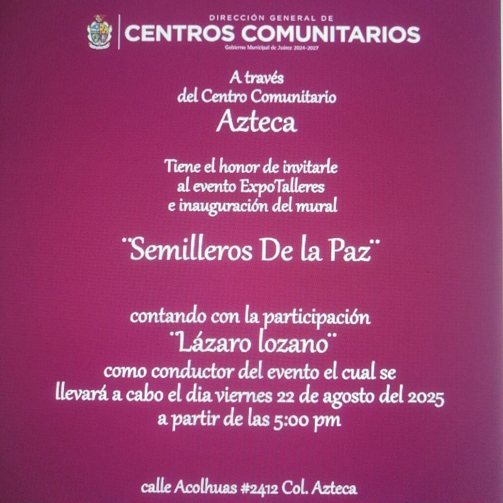 Viernes 22 de Agosto del 2025.- La Dirección de Centros Comunitarios invita este viernes 22 de agosto al evento de expo talleres, así como a la inauguración de un mural, con la participación del colectivo Semilleros de la paz. El titular de la dependencia, Luis Fernando Rodríguez Giner, dio a conocer que la exposición es de alumnos del taller Semilleros…