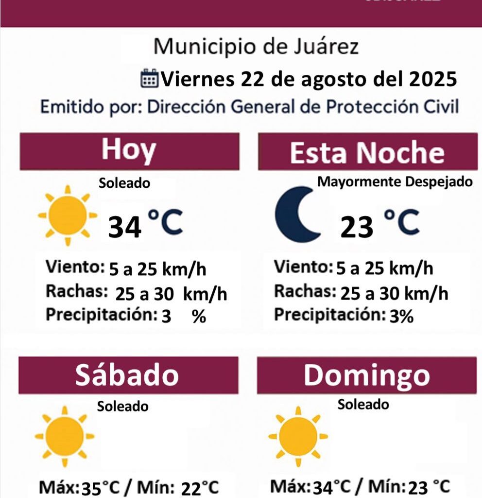 Viernes 22 de Agosto del 2025.- La Dirección General de Protección Civil informó que para este viernes 22 de agosto se espera un día soleado, con una temperatura máxima de 34 grados centígrados y mínima de 23. Los vientos oscilarán entre 5 y 25 kilómetros por hora, con rachas de hasta 30 km/h y una ligera probabilidad de precipitación del…