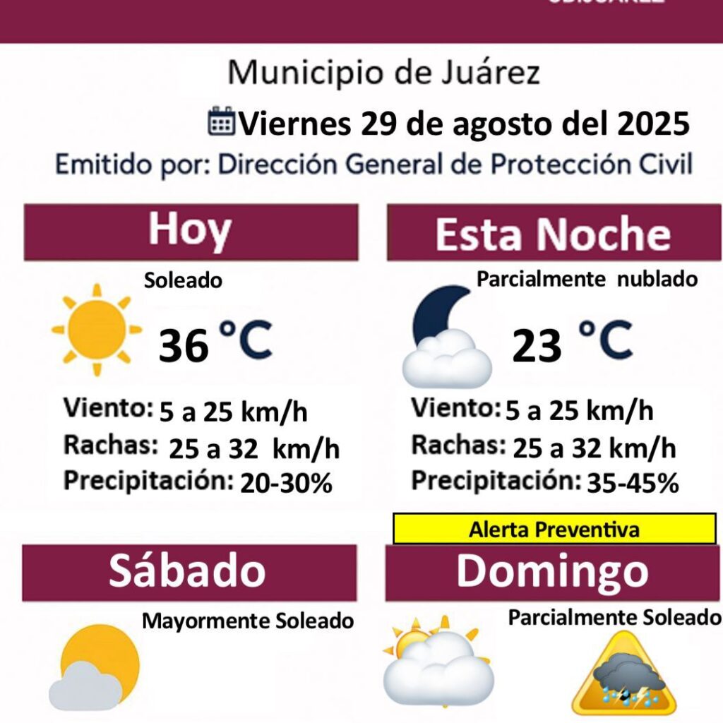 Viernes 29 de Agosto del 2025.- La Dirección General de Protección Civil del Municipio emitió el pronóstico del clima correspondiente a hoy viernes 29 de agosto. Para este día se prevé un ambiente soleado con una temperatura máxima de 36 grados centígrados, vientos de 5 a 25 kilómetros por hora y rachas de 25 a 32 kilómetros por hora, así…
