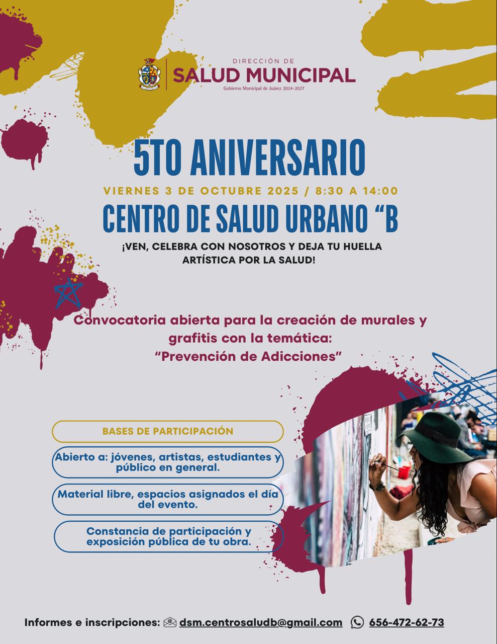 Lunes 1 de Septiembre del 2025.- La Dirección de Salud municipal invita el próximo viernes 3 de octubre, de 8:30 de la mañana a 3:00 de la tarde, a las actividades por el quinto aniversario del Centro de Salud Urbano B.