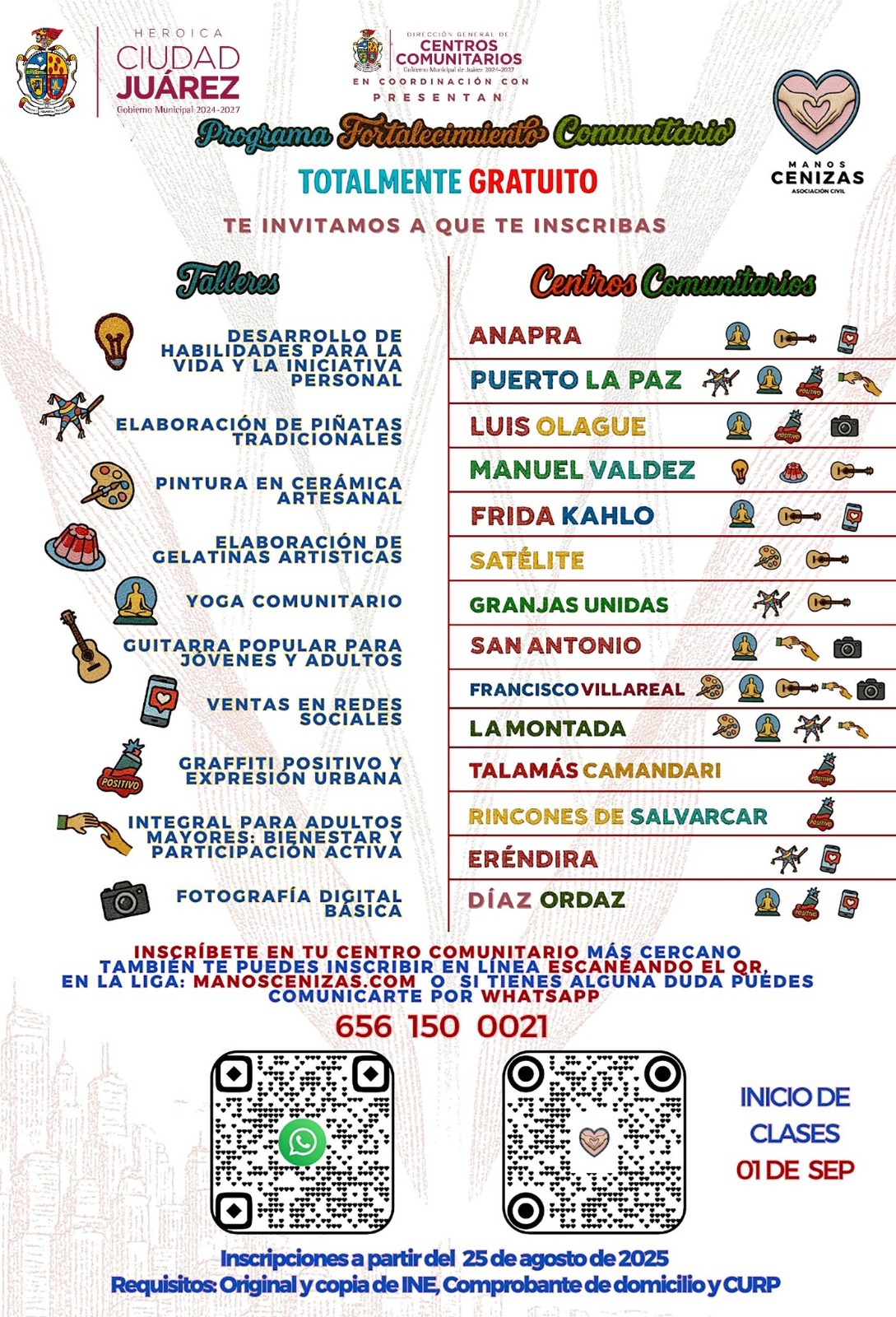 Lunes 1 de Septiembre del 2025.- La Asociación Civil Manos Cenizas, en colaboración con la Dirección General de Centros Comunitarios, ofrece a toda la ciudadanía diversos talleres a partir de este lunes 1 de septiembre.