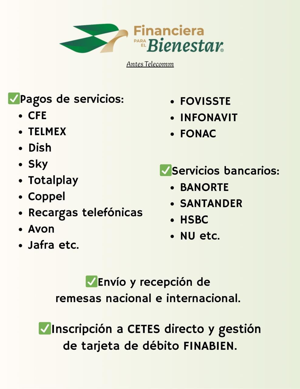 “También se puede hacer envío y recepción de remesas nacional e internacional, así como gestión de tarjeta de débito de Financiera para el Bienestar”, explicó.