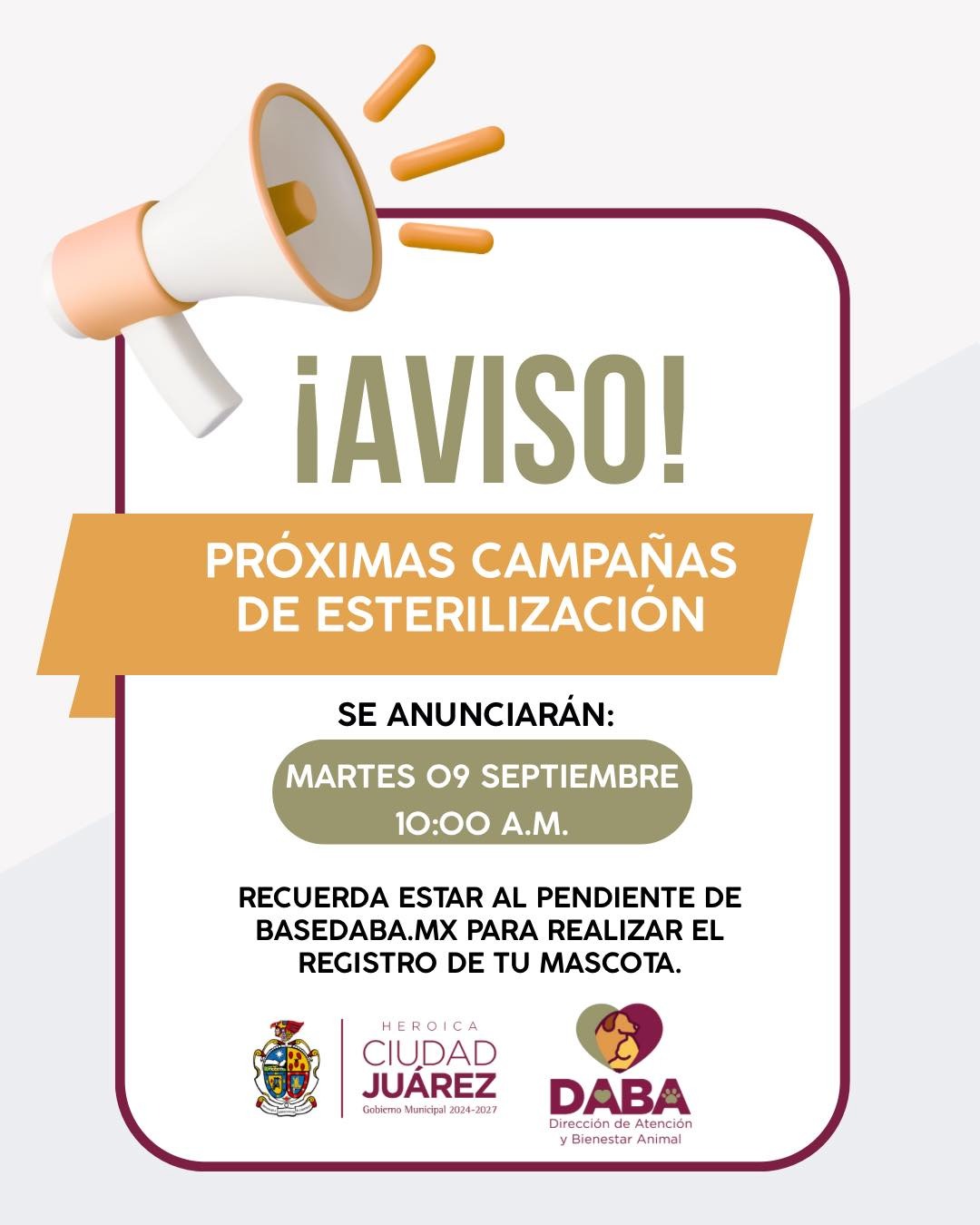 Miércoles 3 de Septiembre del 2025.- La Dirección de Atención y Bienestar Animal (DABA), estará informando la próxima semana sobre las campañas de esterilización que se llevarán a cabo de forma gratuita en algún sector de la ciudad, por lo que se pide estar pendientes de las fechas y los lugares.