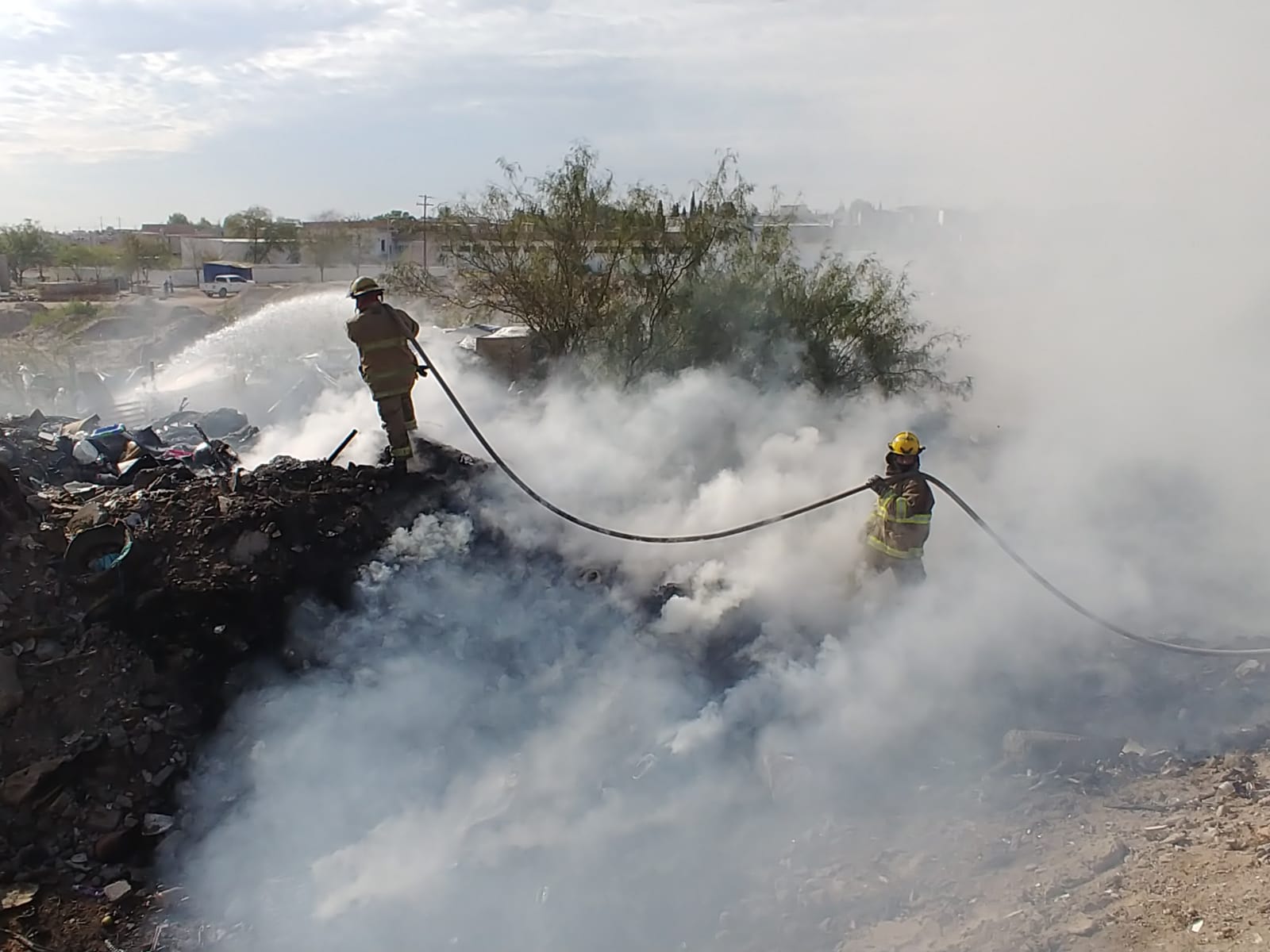 En el sitio se reportó la quema de basura y neumáticos acumulados. Para controlar el siniestro acudieron las unidades 23 y Cisterna 24 de Bomberos, quienes aún trabajan en las labores de sofocación, evitando que las llamas se extiendan hacia predios o viviendas cercanas.
