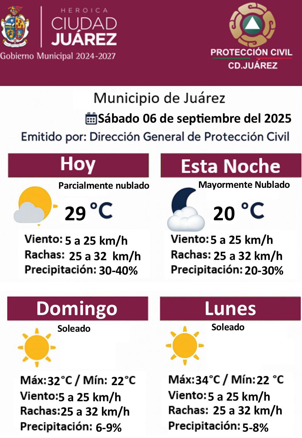 Sábado 6 de Septiembre del 2025.- La Dirección General de Protección Civil del Municipio de Juárez informó sobre las condiciones meteorológicas para este sábado 6 de septiembre de 2025 y los próximos días.