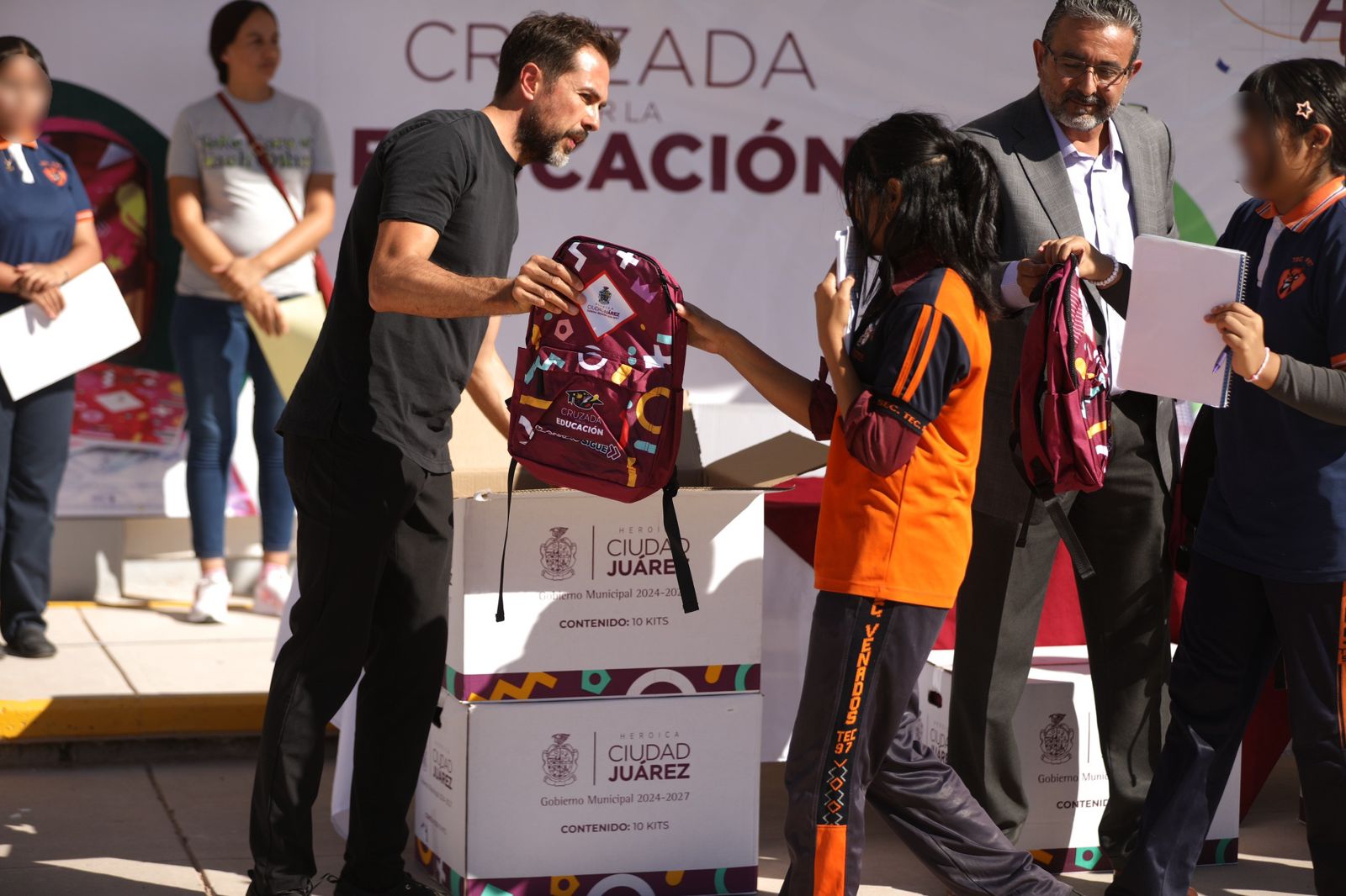Jueves 11 de Septiembre del 2025.- En apoyo a la comunidad estudiantil de Ciudad Juárez, personal de la Dirección General de Obras Públicas hizo la entrega simbólica de mochilas, loncheras y útiles escolares a estudiantes de plantes escolares en sus turnos matutino y vespertino, como parte de la Cruzada por la Educación.