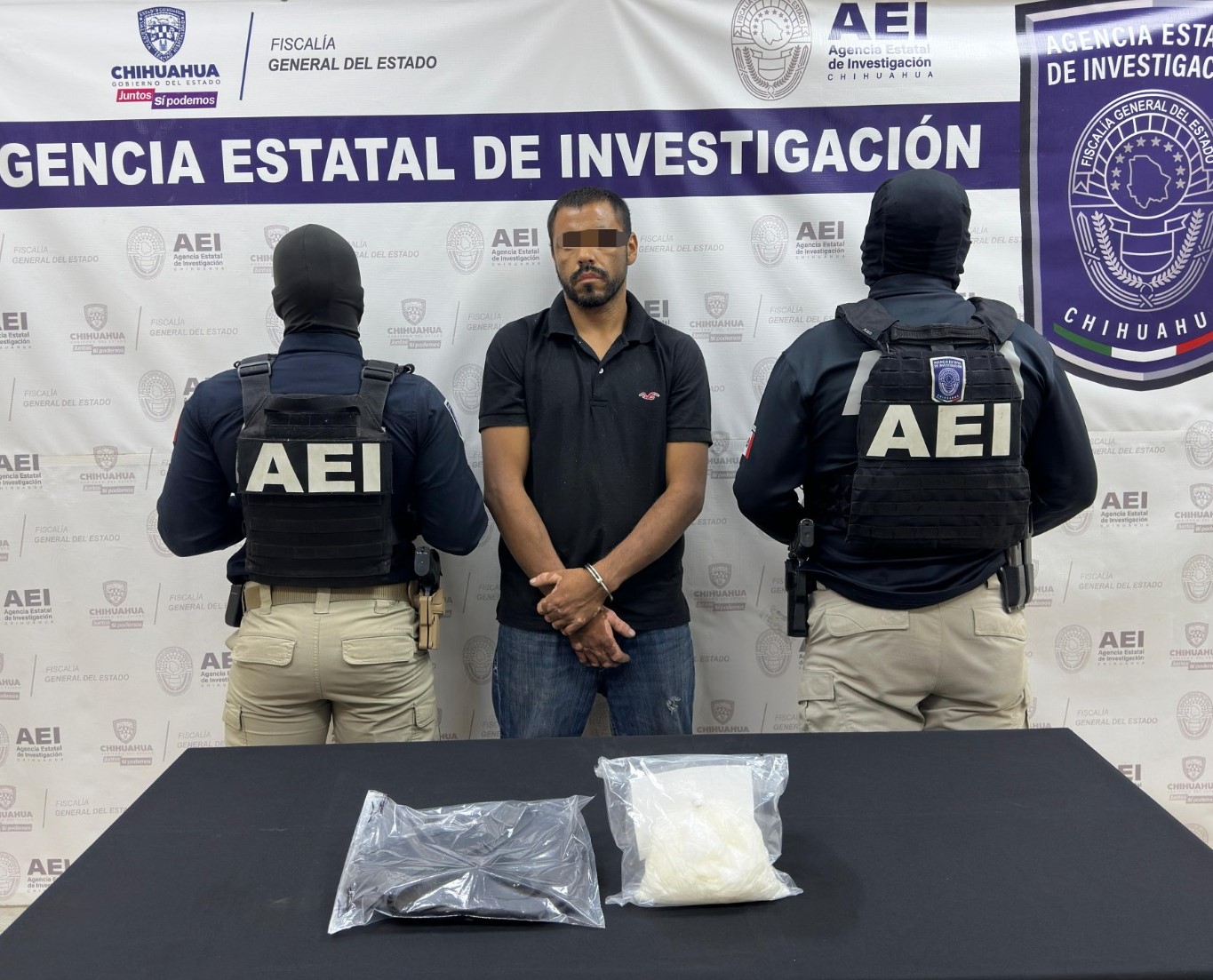 Ciudad Juárez, Chih., a 17 de septiembre de 2025.- Elementos de la Agencia Estatal de Investigación, adscritos al Centro de Operaciones Estratégicas (COE), de la Fiscalía de Distrito Zona Norte, detuvieron a quien se identificó como Jesús A. S., por delitos contra la salud, cometido en el fraccionamiento Misiones de Creel en Ciudad Juárez.