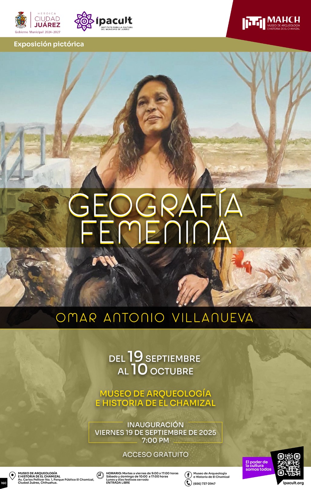 Jueves 18 de Septiembre del 2025.- El Instituto para la Cultura del Municipio de Juárez (IPACULT) invita a la comunidad fronteriza a la inauguración de la exposición pictórica “Geografía Femenina” del artista Omar Antonio Villanueva, que se llevará a cabo este viernes 19 de septiembre a las 7:00 de la tarde en el Museo de Arqueología e Historia de El Chamizal (MAHCH).
