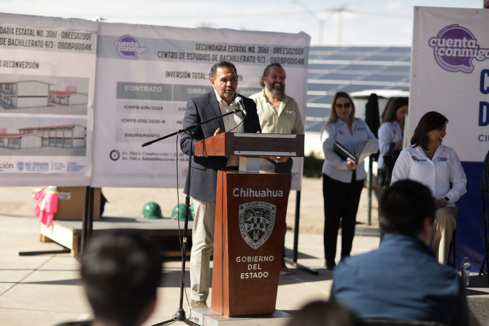 En el evento estuvieron presentes Zaira Nohemí Iturbude, titular de la gerencia de Coordinación de Proyectos de Infraestructura Educativa; Ulises García Soto, delegado de la SEP; Marcos Gallegos, de la Dirección Estatal de Bachillerato; el diputado Óscar Avitia; Teresa de Jesús López, de Servicios Educativos del Estado de Chihuahua; Francisco Gutiérrez, secretario de Educación y Deporte del Gobierno del Estado; así como diputados y regidores.