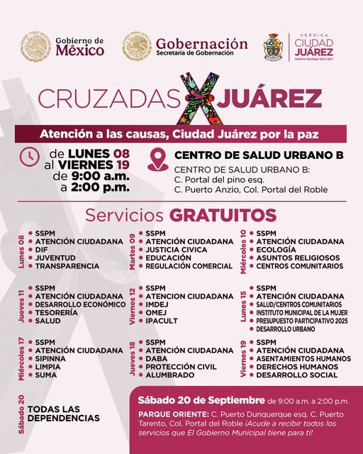 Viernes 19 de Septiembre del 2025.- Mañana sábado 20 de septiembre de 9:00 de la mañana a 2:00 de la tarde en el Parque Oriente, ubicado en Puerto Tarento y Puerto Dunquerque, en la colonia Portal de Roble, se llevará a cabo el programa “Atención a las Causas, Ciudad Juárez por la Paz”.