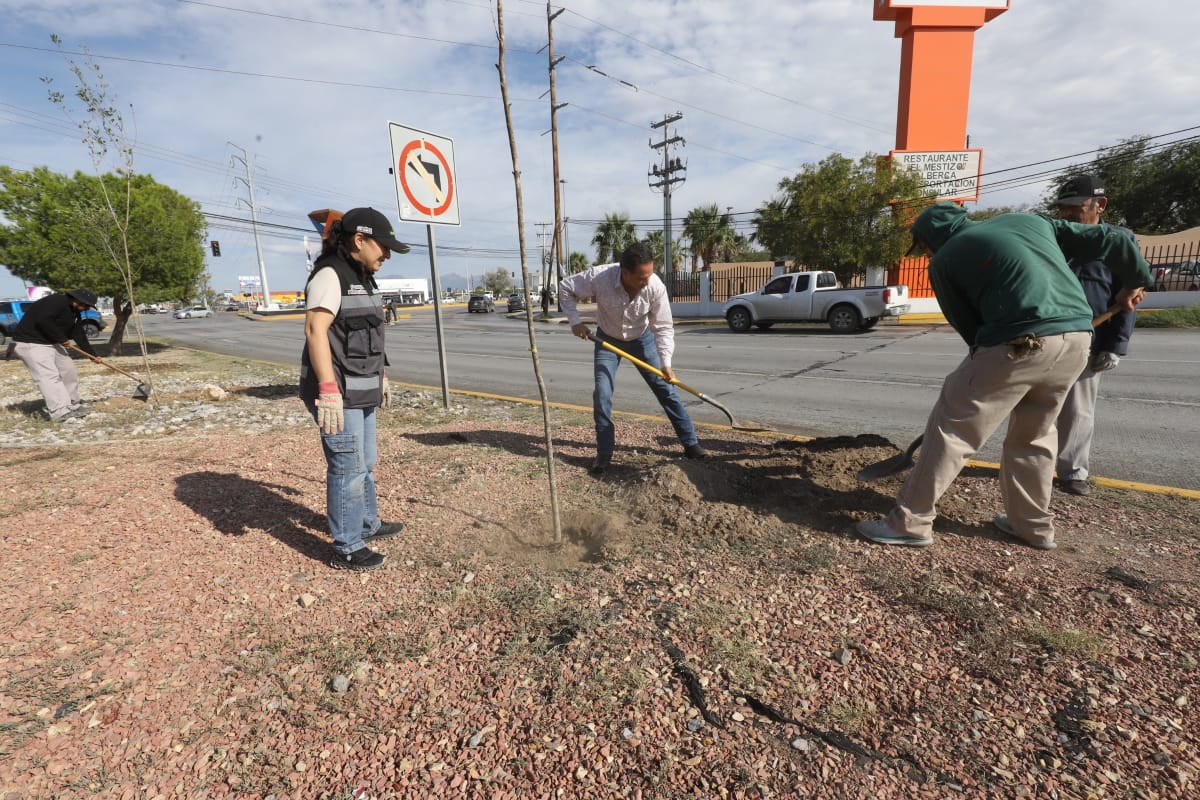 Lunes 22 de Septiembre del 2025.- La Dirección de Parques y Jardines llevó a cabo la plantación de 45 árboles más en el camellón de la avenida Ejército Nacional, en el tramo comprendido entre Rancho Mesteñas y Paseo de la Victoria, con la finalidad de fortalecer las áreas verdes y embellecer la imagen urbana, con estas acciones suman ya 345 árboles plantados en dicho sector de la ciudad.