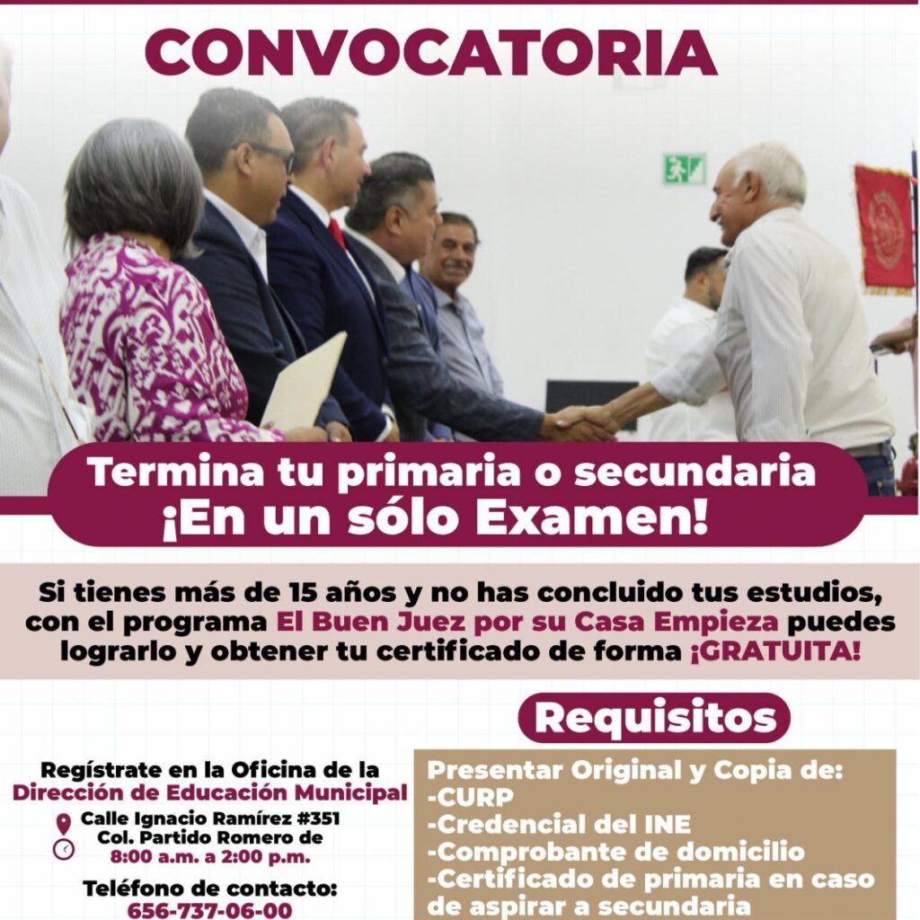 Miércoles 24 de Septiembre del 2025.- La Dirección de Educación Municipal, en coordinación con el Instituto Chihuahuense de Educación para los Adultos (ICHEA), invita a la ciudadanía a participar en el programa “El buen juez por su casa empieza”, mediante el cual es posible obtener el certificado de primaria o secundaria con un solo examen. Guillermo Enrique Alvídrez Olivas, titular…
