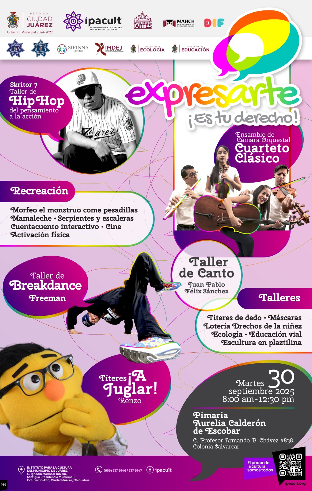 Lunes 29 de Septiembre del 2025.- Con el firme propósito de acercar el arte y la cultura a la niñez juarense, el Instituto para la Cultura del Municipio de Juárez (IPACULT) llevará este martes 30 de septiembre a la Escuela Primaria Aurelia Calderón de Escobar su programa “Expresarte ¡es tu derecho!”, una iniciativa que combina creatividad, diversión y aprendizaje sobre los derechos de la infancia.