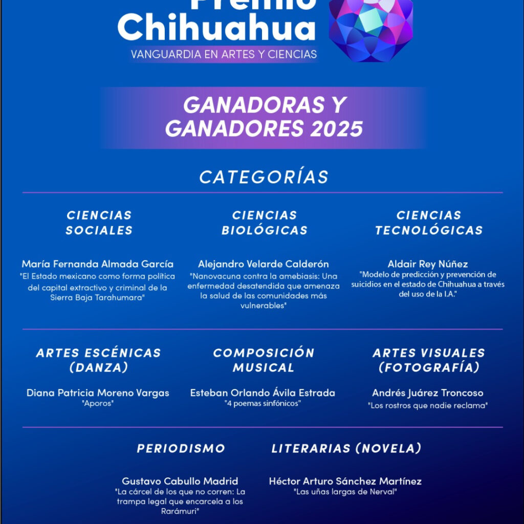 El Gobierno del Estado, a través de la Secretaría de Cultura, anunció los nombres de las y los ganadores del Premio Chihuahua Vanguardia en Artes y Ciencias 2025. El galardón entrega un estímulo de 100 mil pesos a los mejores proyectos en las categorías de Artes Visuales, Música, Literatura, Periodismo, Ciencias Sociales, Ciencias Biológicas y Ciencias Tecnológicas. La lista fue…
