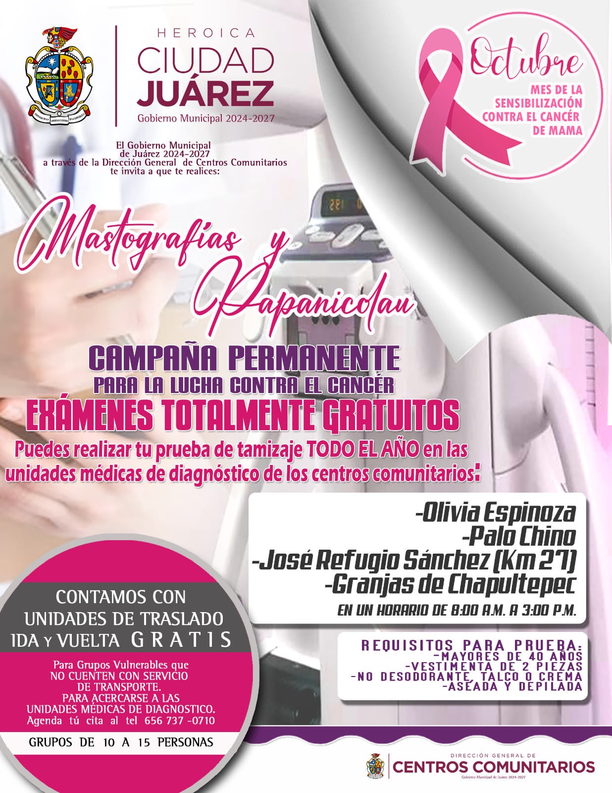 Viernes 3 de Octubre del 2025.- El Gobierno Municipal, a través de la Dirección de Centros Comunitarios, ofrece mastografías y papanicolaou gratis.