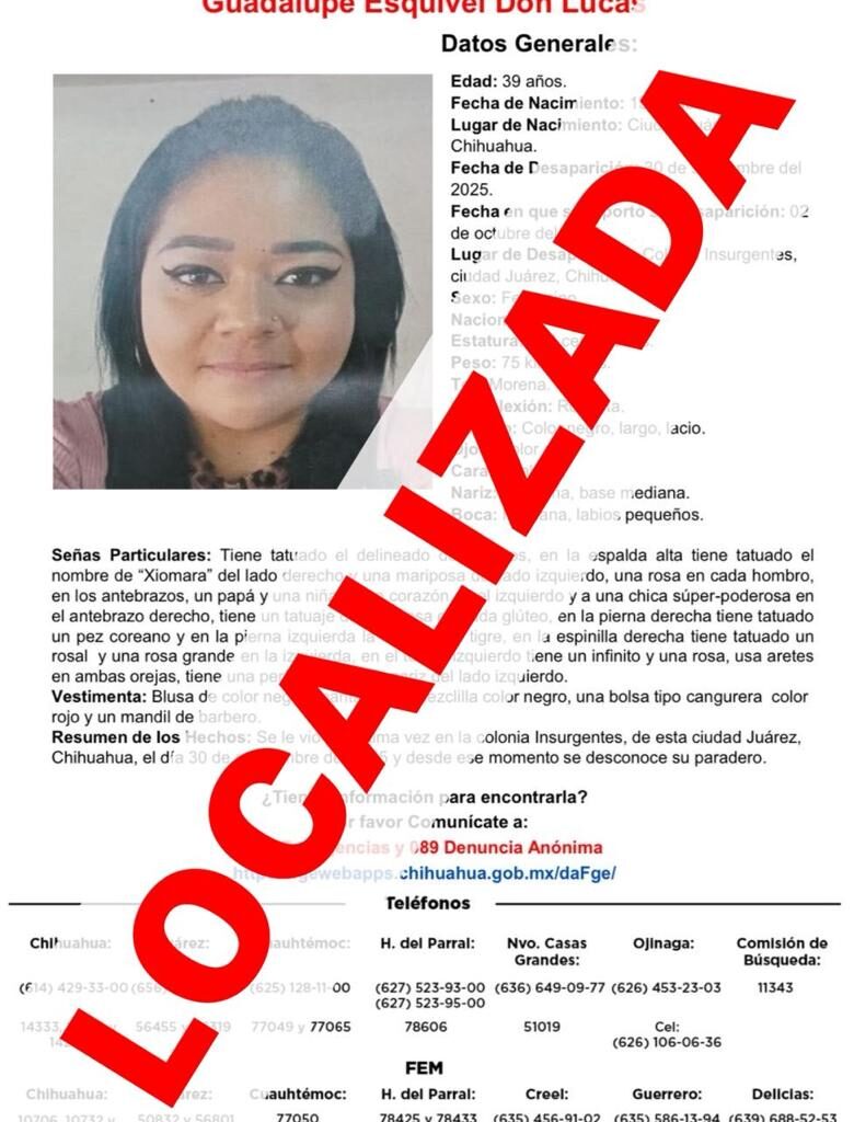 Ciudad Juárez, Chih., a 05 de octubre de 2025.- La Fiscalía Especializada en Atención a Mujeres Víctimas del Delito por Razones de Género y a la Familia de la Zona Norte, localizó sana y salva a la mujer de iniciales G. E. D., de 39 de edad, que contaba con reporte de desaparición y/o ausencia, en Ciudad Juárez. Ella se…