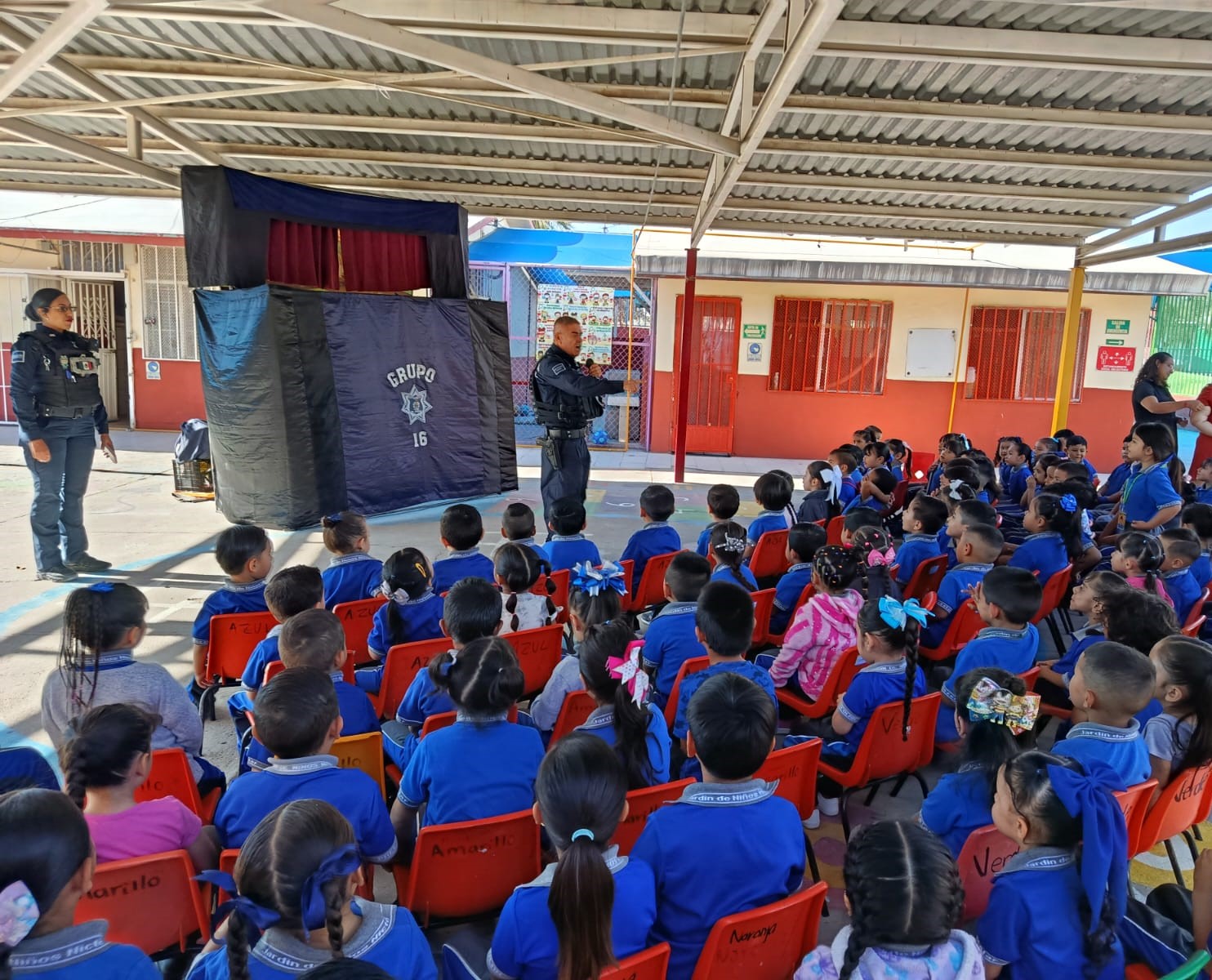 A 06 de octubre de 2025.- La Secretaría de Seguridad Pública Municipal, a través de la Dirección de Prevención Social, llevó a cabo una presentación de “Teatrino” en el Jardín de Niños Nicté, con el objetivo de fomentar en la niñez valores de respeto, seguridad y convivencia.