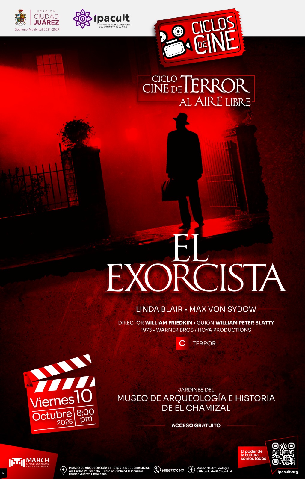 Lunes 6 de Octubre del 2025.- El Instituto para la Cultura del Municipio de Juárez (IPACULT) continúa acercando el séptimo arte a la comunidad con su programa “Ciclos de Cine”, que en esta ocasión presentará el icónico filme El Exorcista el próximo viernes 10 de octubre a las 8:00 de la noche, en el jardín del Museo de Arqueología e Historia de El Chamizal (MAHCH).