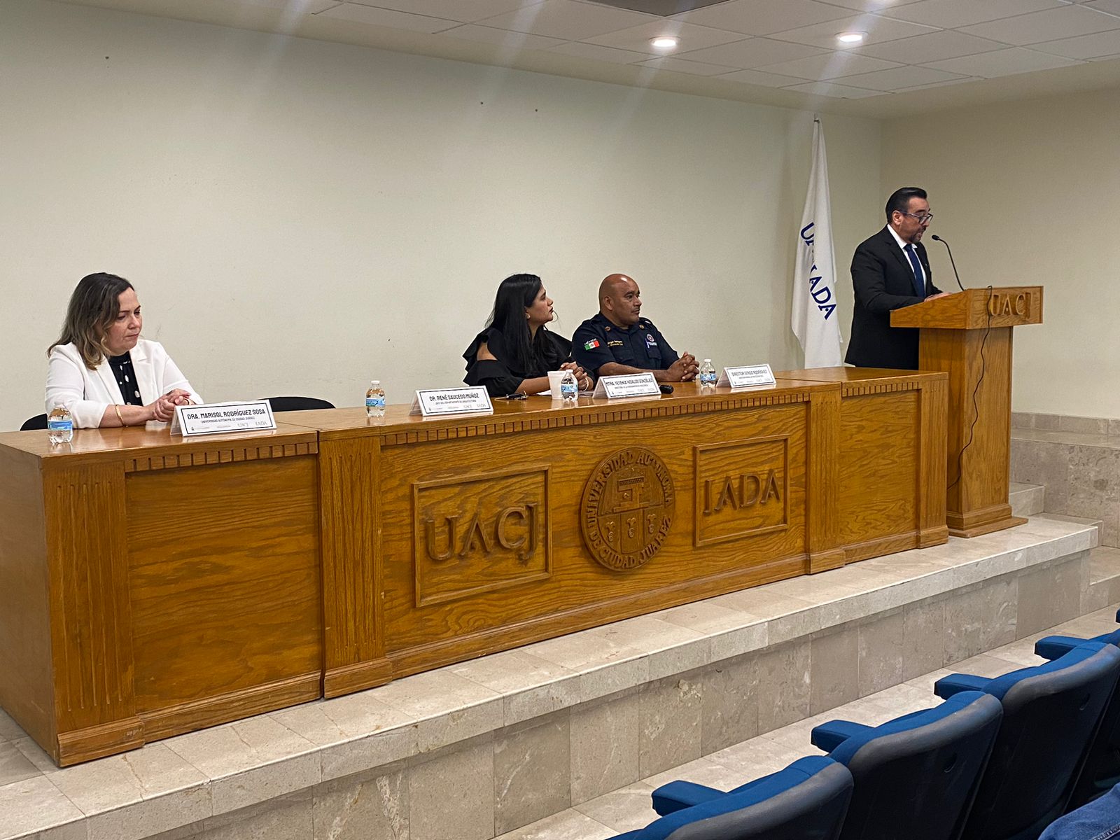 El conversatorio contó con la participación de Marisol Rodríguez Sosa, profesora de tiempo completo de la UACJ, y Sergio Rodríguez, director general de Protección Civil del Municipio de Juárez, quienes compartieron sus experiencias y perspectivas sobre la gestión integral del riesgo y la respuesta oportuna ante emergencias.