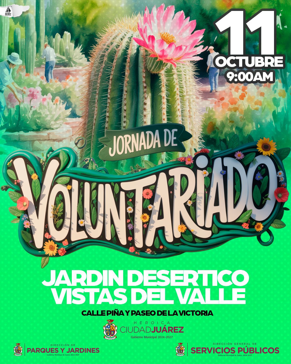 Martes 7 de Octubre del 2025.- La Dirección de Parques y Jardines invita a la ciudadanía a participar en la próxima jornada de voluntariado que se llevará a cabo el próximo sábado 11 a partir de las 9:00 de la mañana, en el Jardín Desértico Vistas del Valle, situado en el cruce de Paseo de la Victoria y calle Piña.