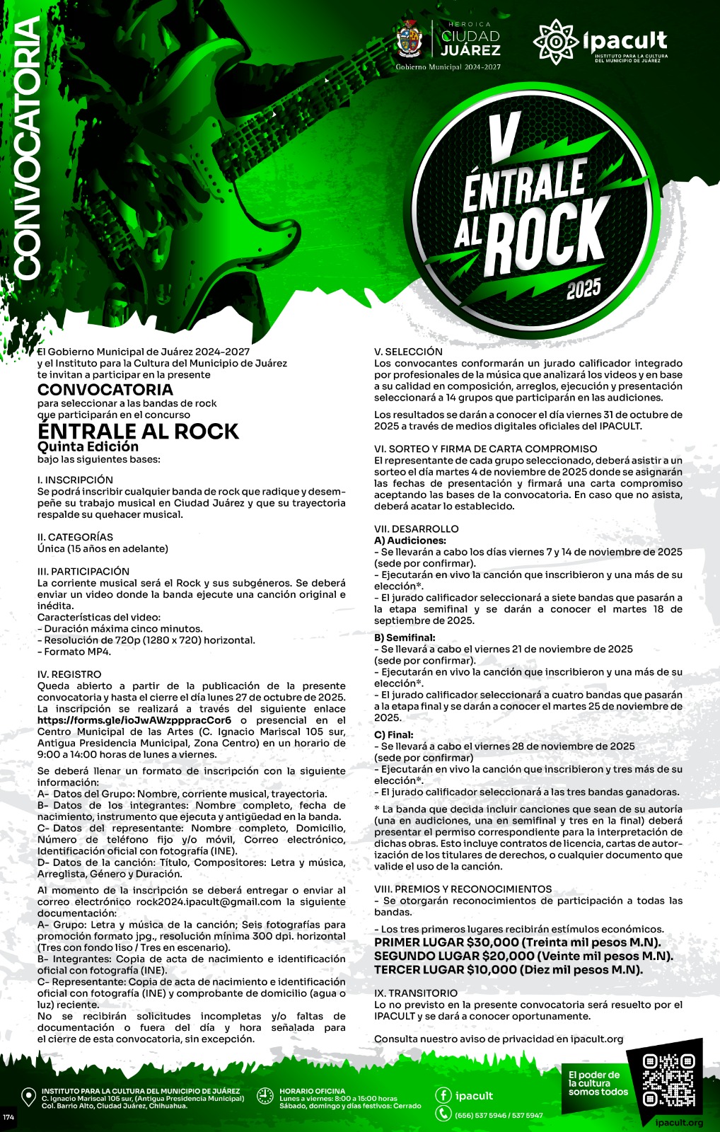 Para conocer todos los detalles, bases y requisitos del certamen, los interesados pueden consultar las redes sociales oficiales del IPACULT, visitar la página www.ipacult.org, comunicarse a los teléfonos 656 537-5946 y 656 537-5947, o escribir al correo rock2024.ipacult@gmail.com.