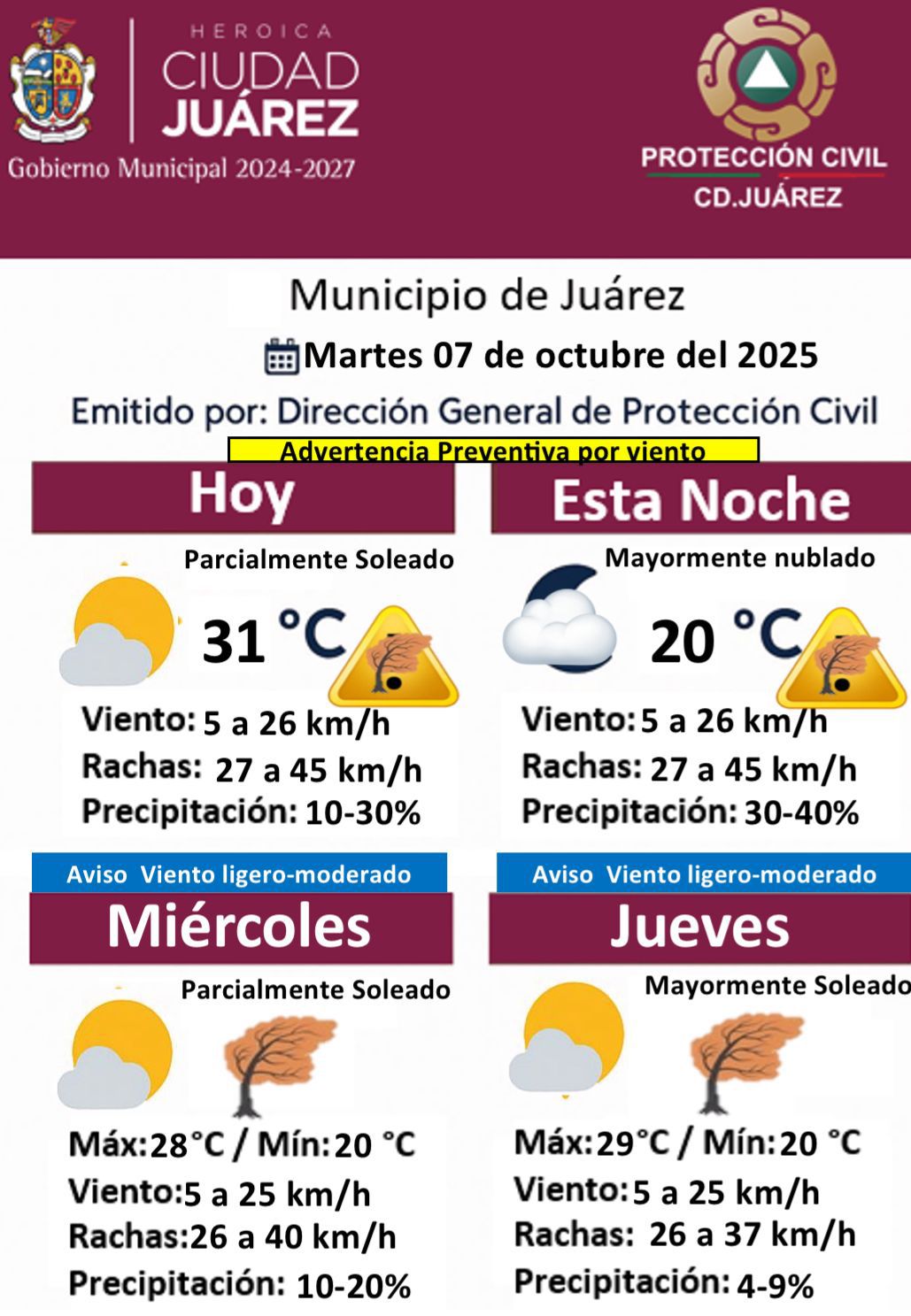 Martes 7 de Octubre del 2025.- La Dirección General de Protección Civil del Gobierno Municipal de Ciudad Juárez emitió una advertencia preventiva por viento para este martes 7 de octubre de 2025, debido a las condiciones climatológicas que se presentan en la región.