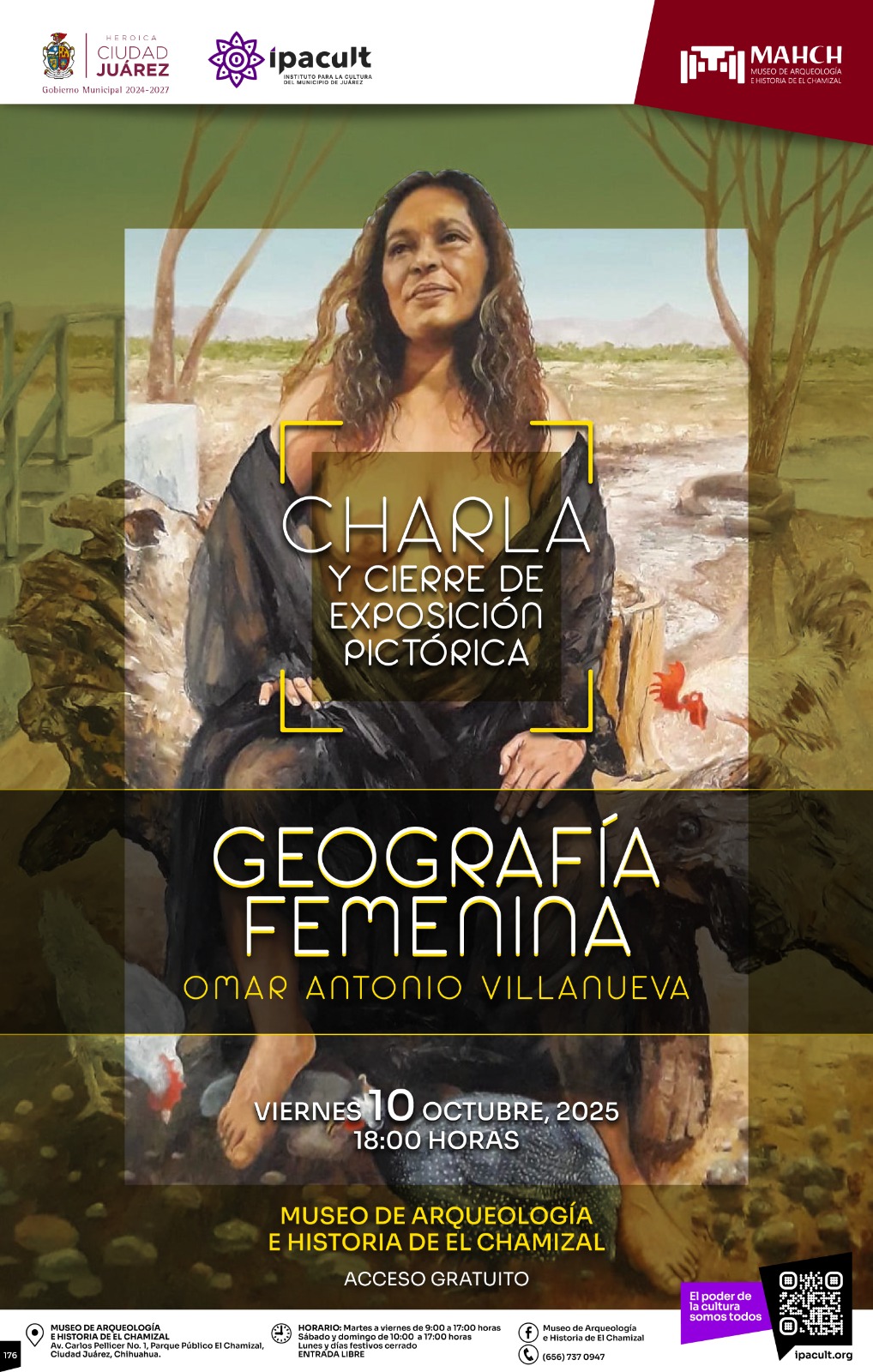 Jueves 9 de Octubre del 2025.- El Instituto para la Cultura del Municipio de Juárez (IPACULT) invita a la comunidad fronteriza a asistir a la plática de cierre de la exposición “Geografía Femenina”, a cargo del artista Omar Antonio Villanueva, este viernes 10 de octubre a las 6:00 de la tarde en el Museo de Arqueología e Historia de El Chamizal (MAHCH).