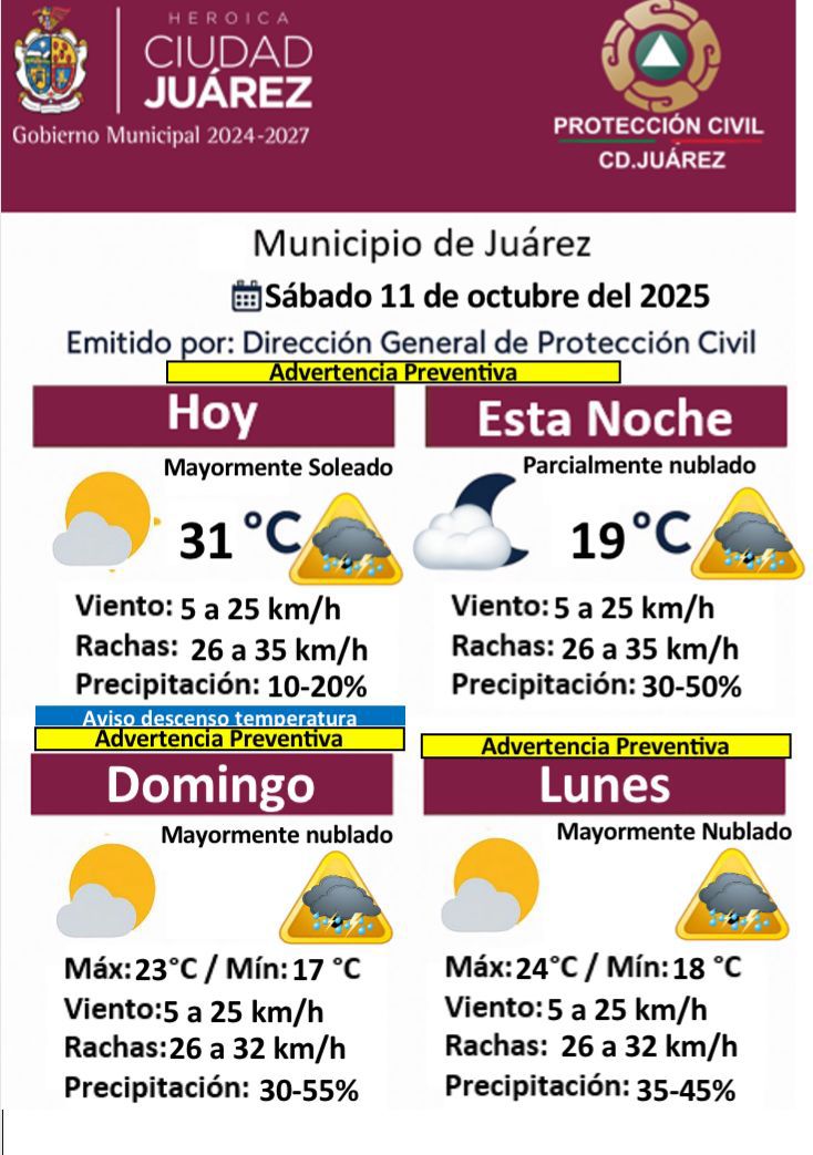 Sábado 11 de Octubre del 2025.- La Dirección General de Protección Civil del Municipio de Juárez emitió una advertencia preventiva para este fin de semana debido a la posibilidad de lluvias, ráfagas de viento y un descenso considerable en la temperatura.