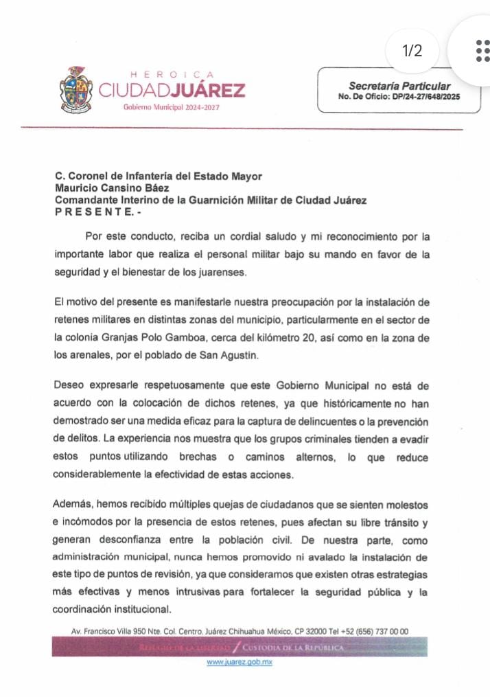 Ciudadanía expresa molestia por operativos; alcalde envía oficio formal para solicitar su eliminación Ciudad Juárez.– En un enérgico reclamo dirigido a la Guarnición Militar, el presidente municipal Cruz Pérez Cuéllar exigió el retiro de los retenes instalados en distintos puntos de la ciudad, al considerarlos ineficaces y motivo de creciente inconformidad entre la ciudadanía. La postura del edil fue dada…